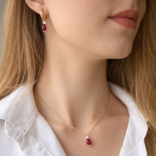 Lásku. Sada náušnic a řetízku s rubínovým kamenem a perlou
