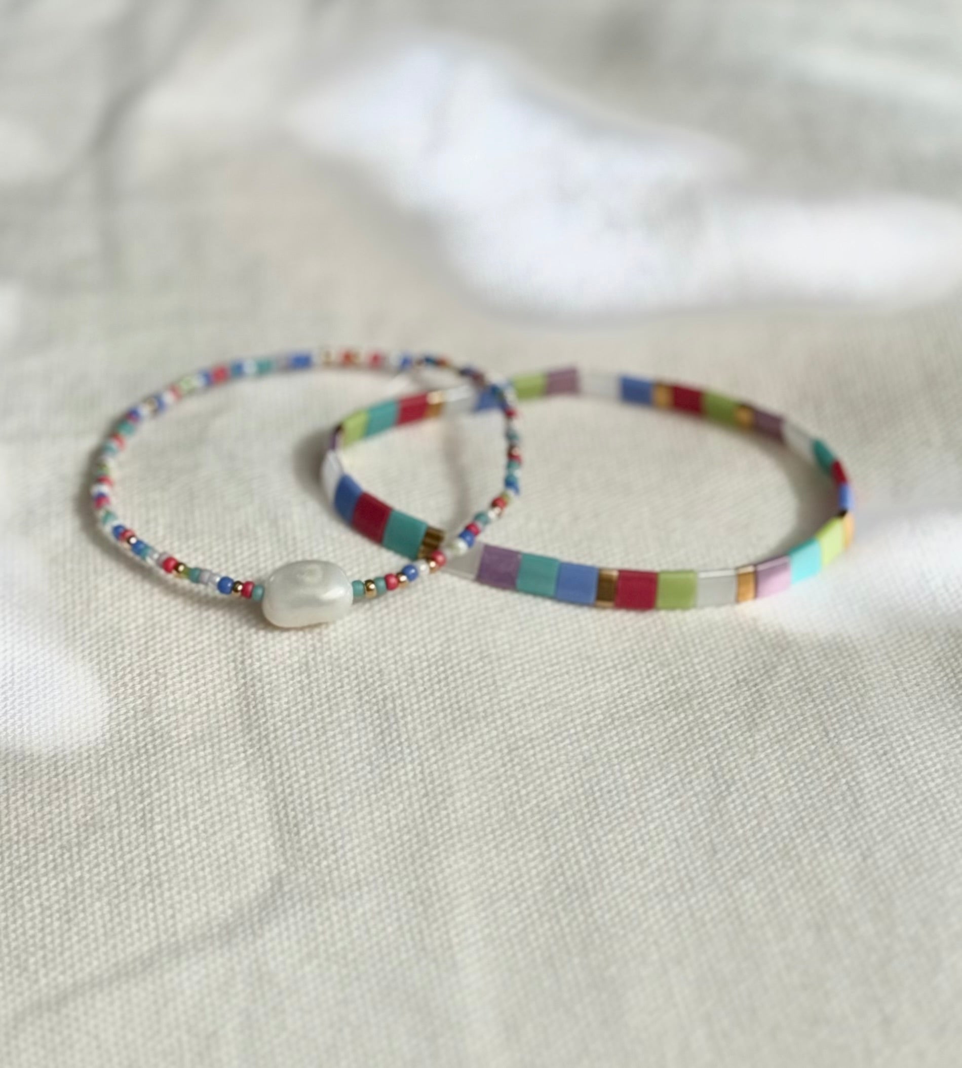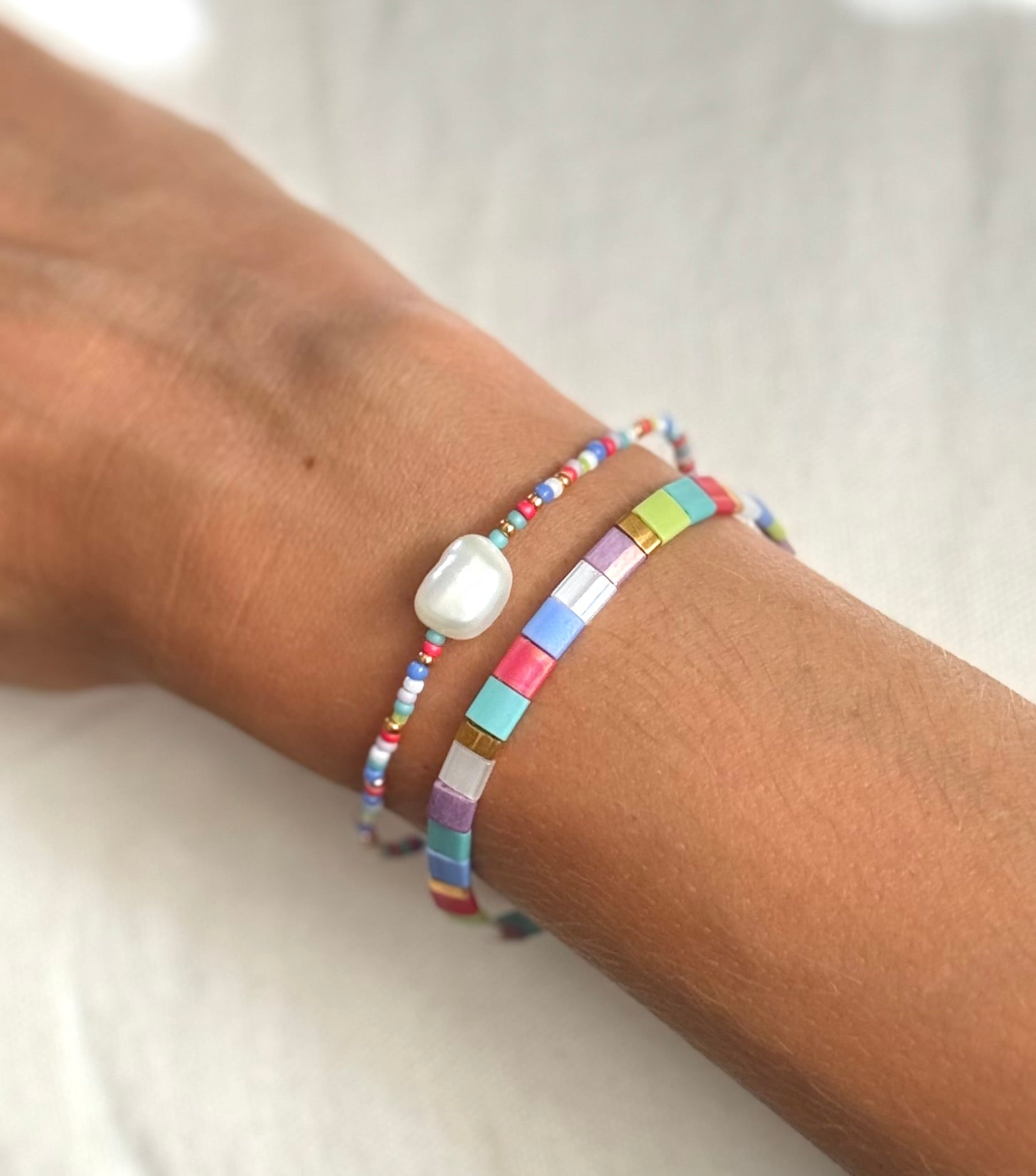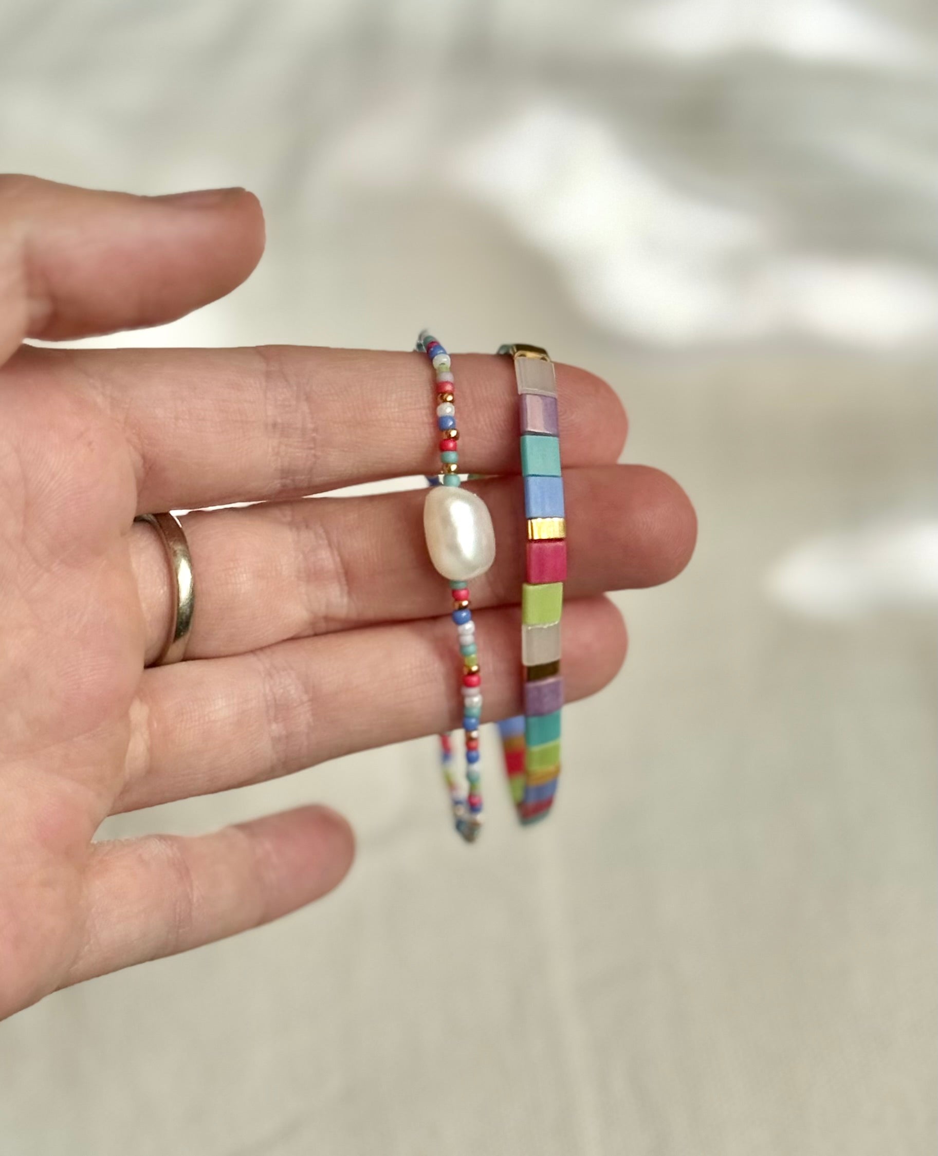 Vesele a zároveň jemně barevná dvojice náramků Pestrost spojuje precizní japonské skleněné korálky Myiuki s krásnou perlou.