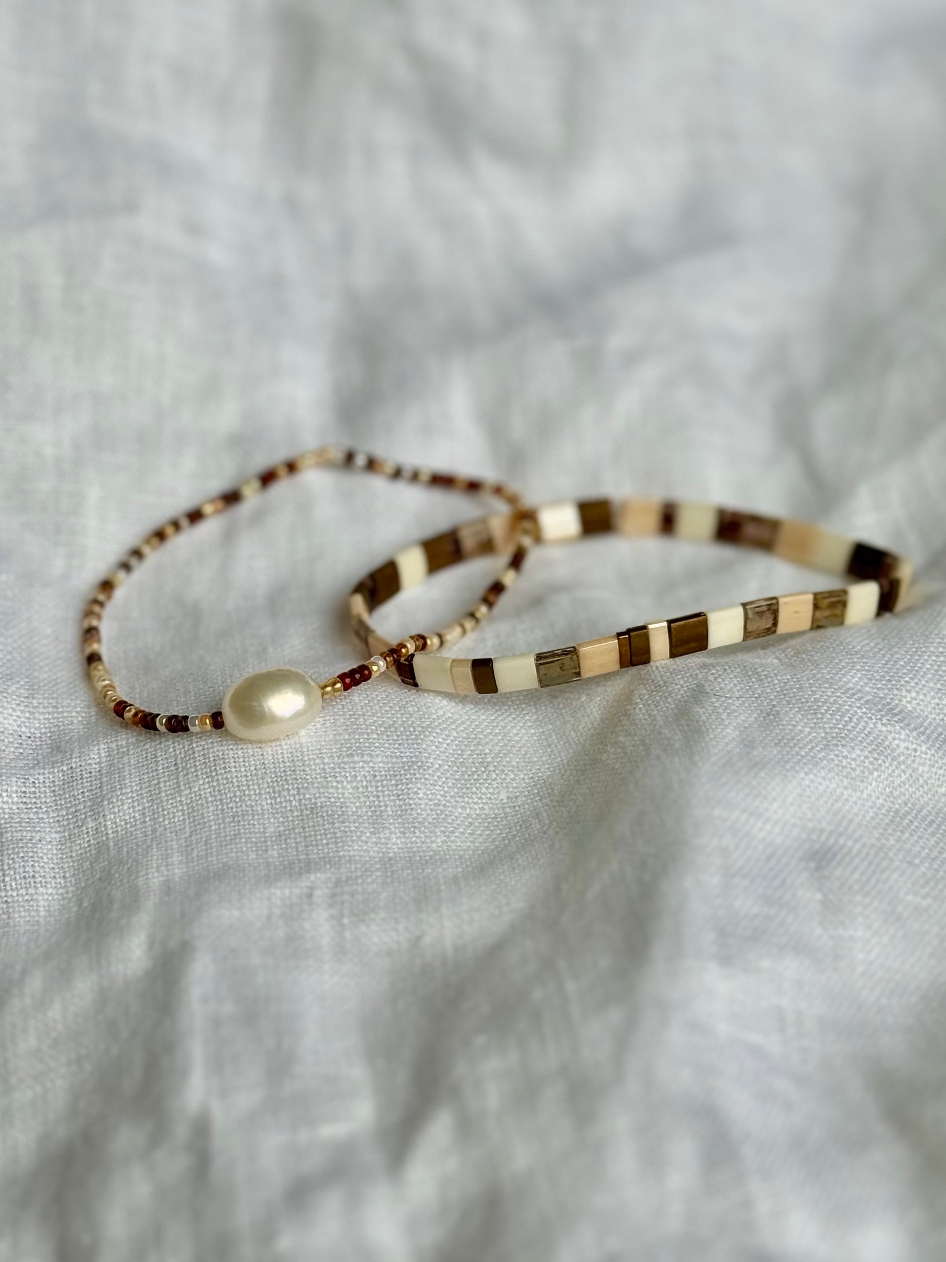 Dvojice náramků Káva v barvách ranní kávy spojuje precizní japonské skleněné korálky Myiuki s krásnou perlou.