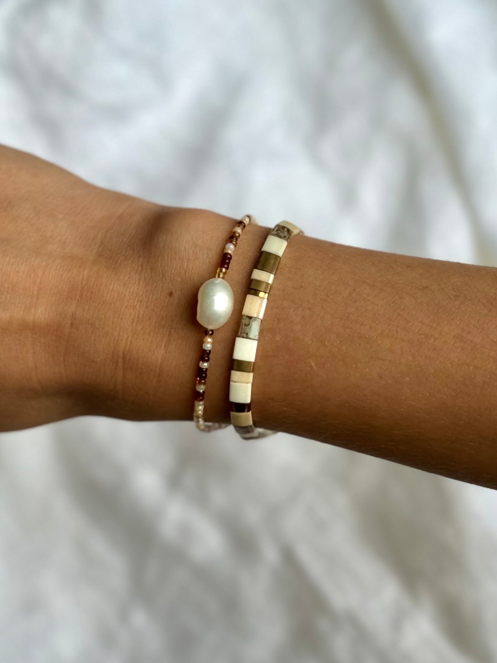 Jeden náramek je tvořen plochými korálky typu TILA, které přinášejí moderní a strukturovaný vzhled, zatímco druhý je vyroben z jemných ROUND korálků doplněný pravou říční perlou, která dodává na výjimečnosti.