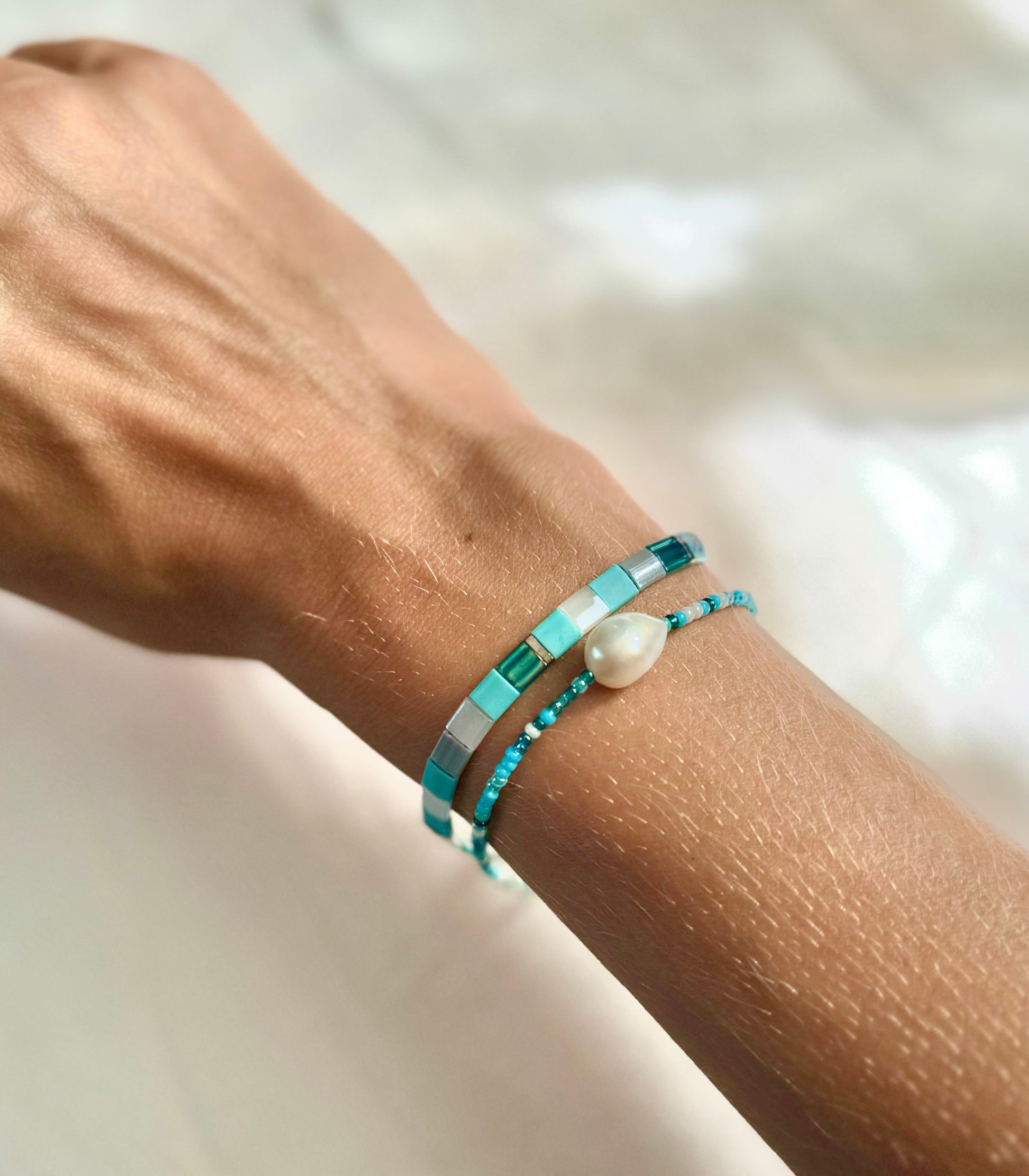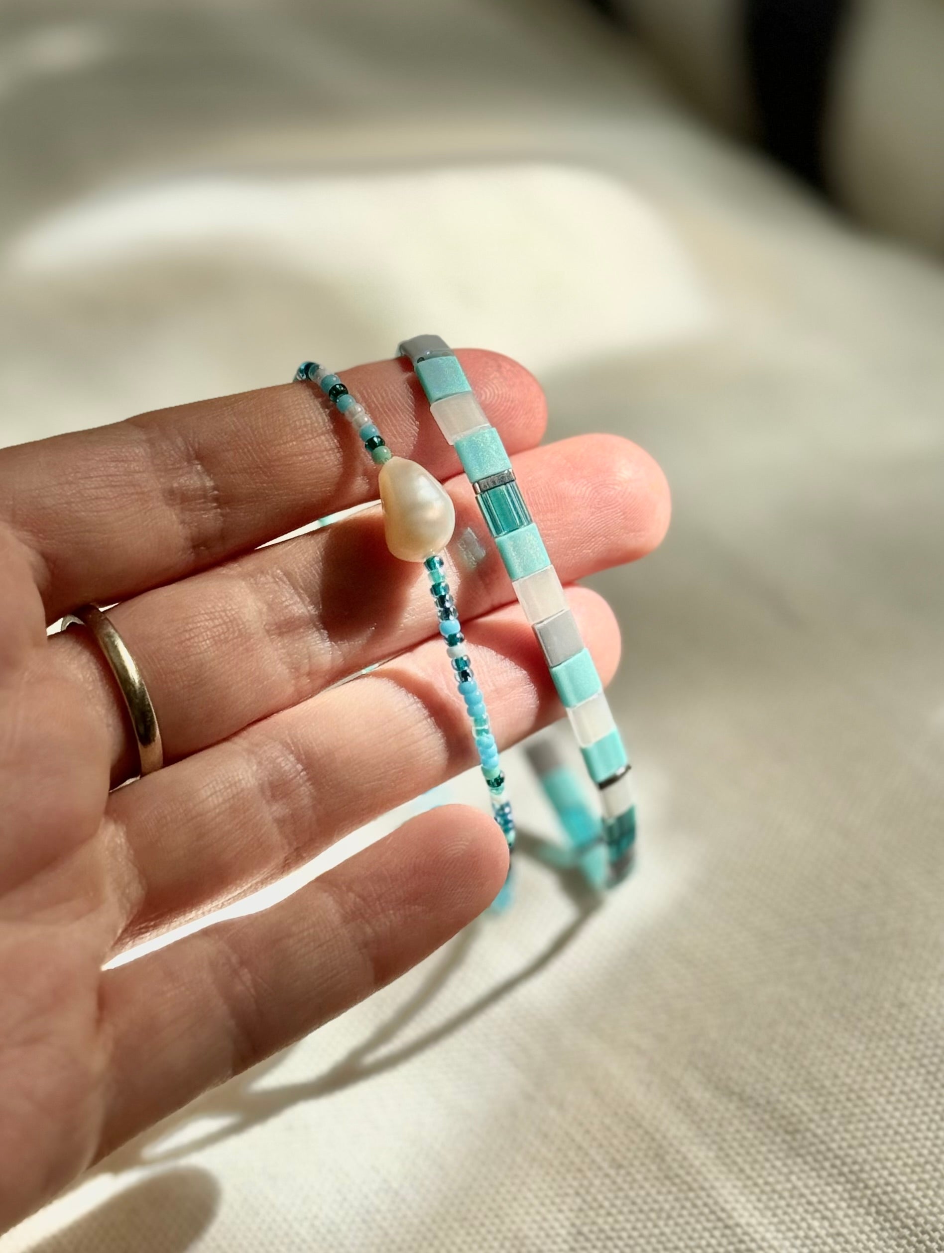 Tato dvojice náramků Mořská pěna v tyrkysových barvách průzračného moře spojuje precizní japonské skleněné korálky Myiuki s krásnou perlou.