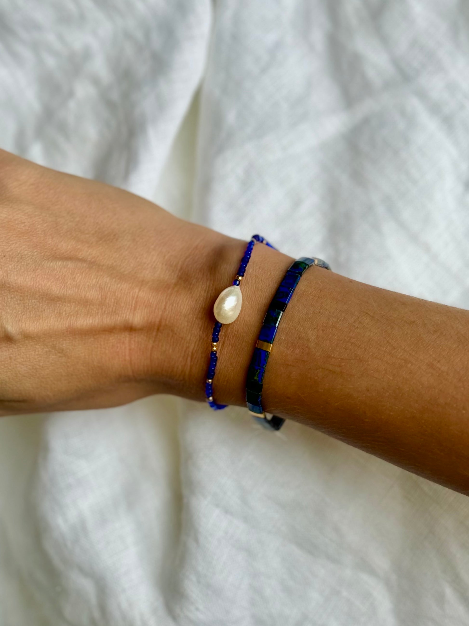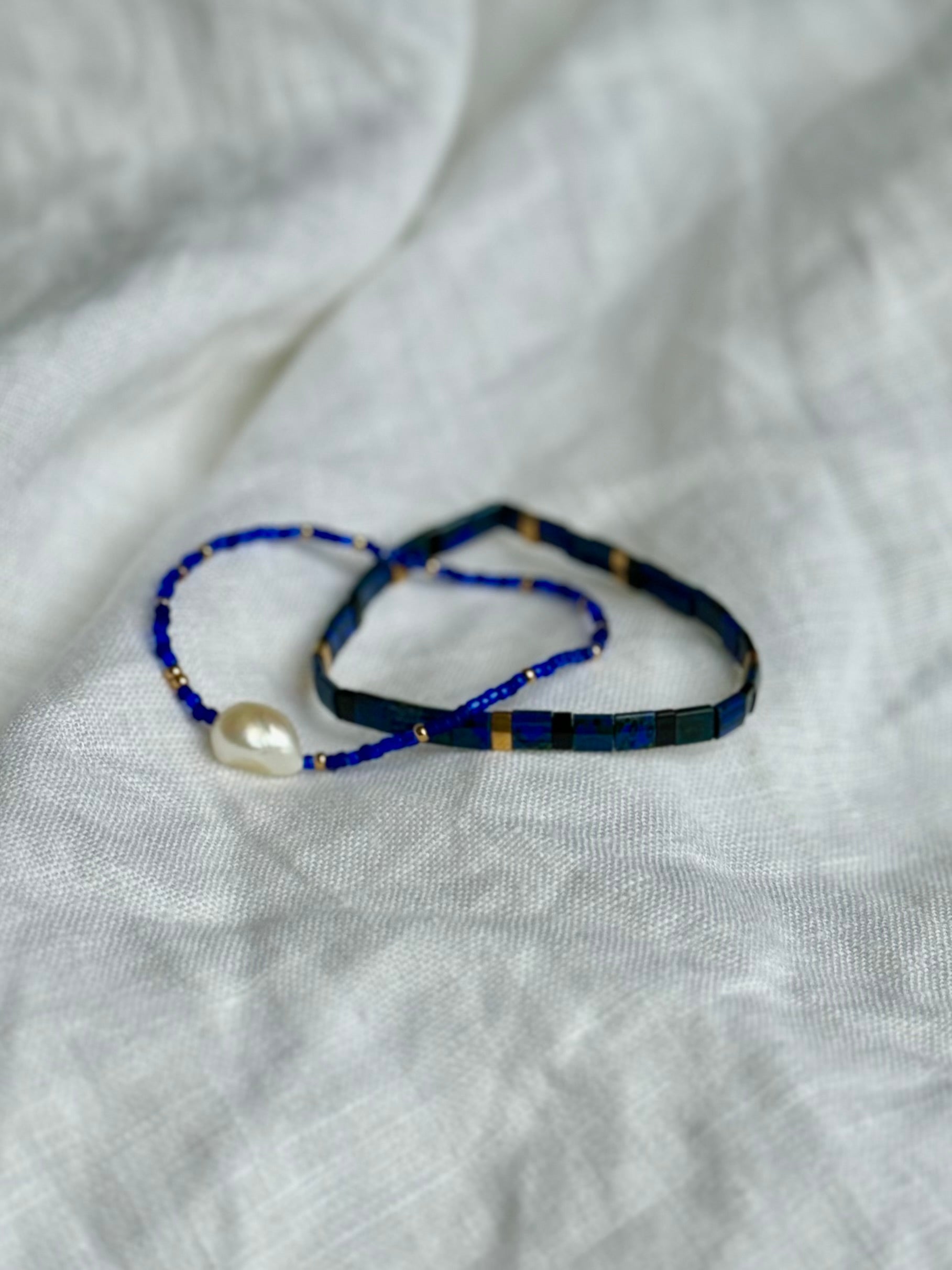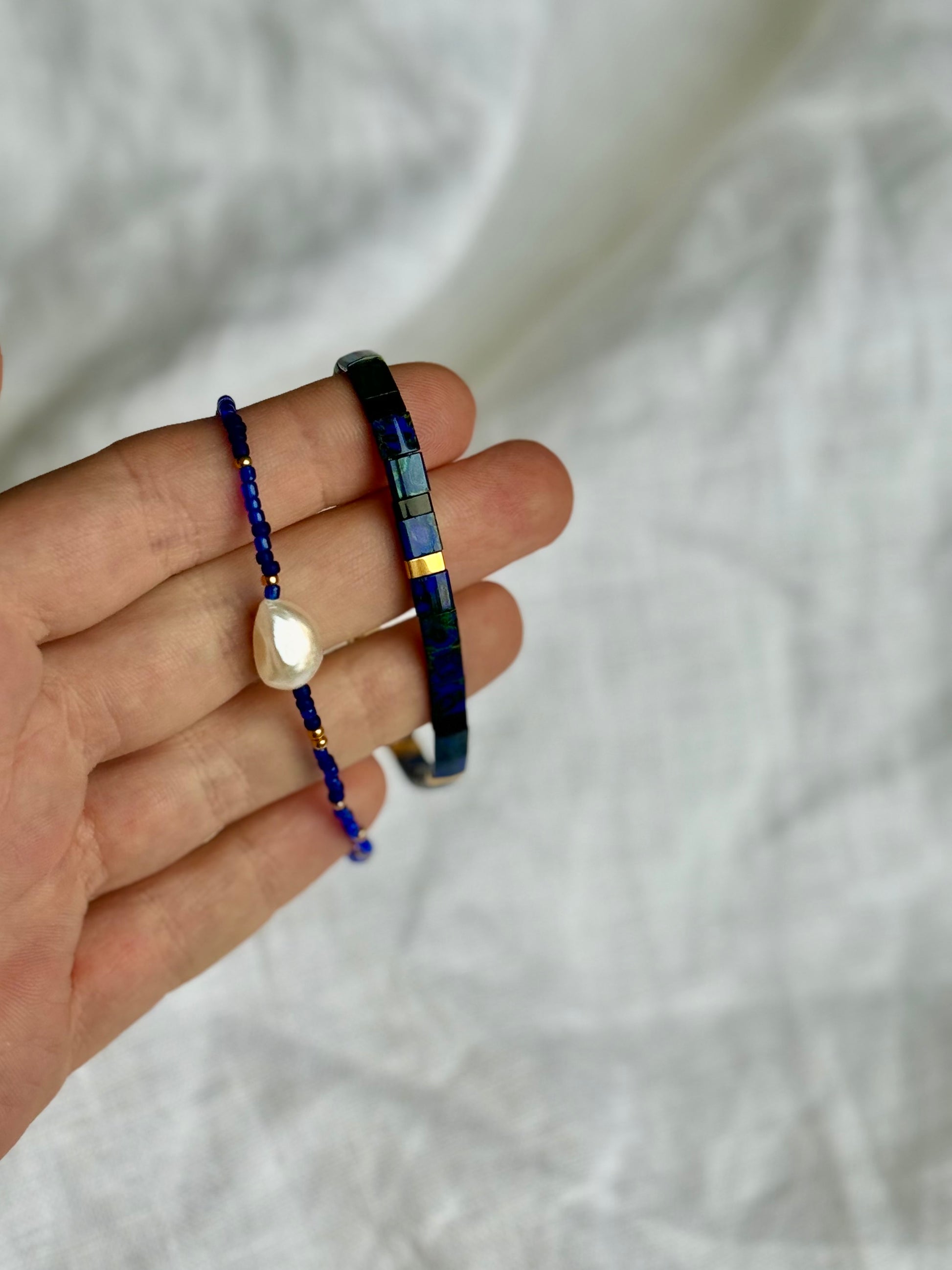 Dvojice náramků NOČNÍ OBLOHA v tmavě modrých barvách spojuje precizní japonské skleněné korálky Myiuki s krásnou perlou.