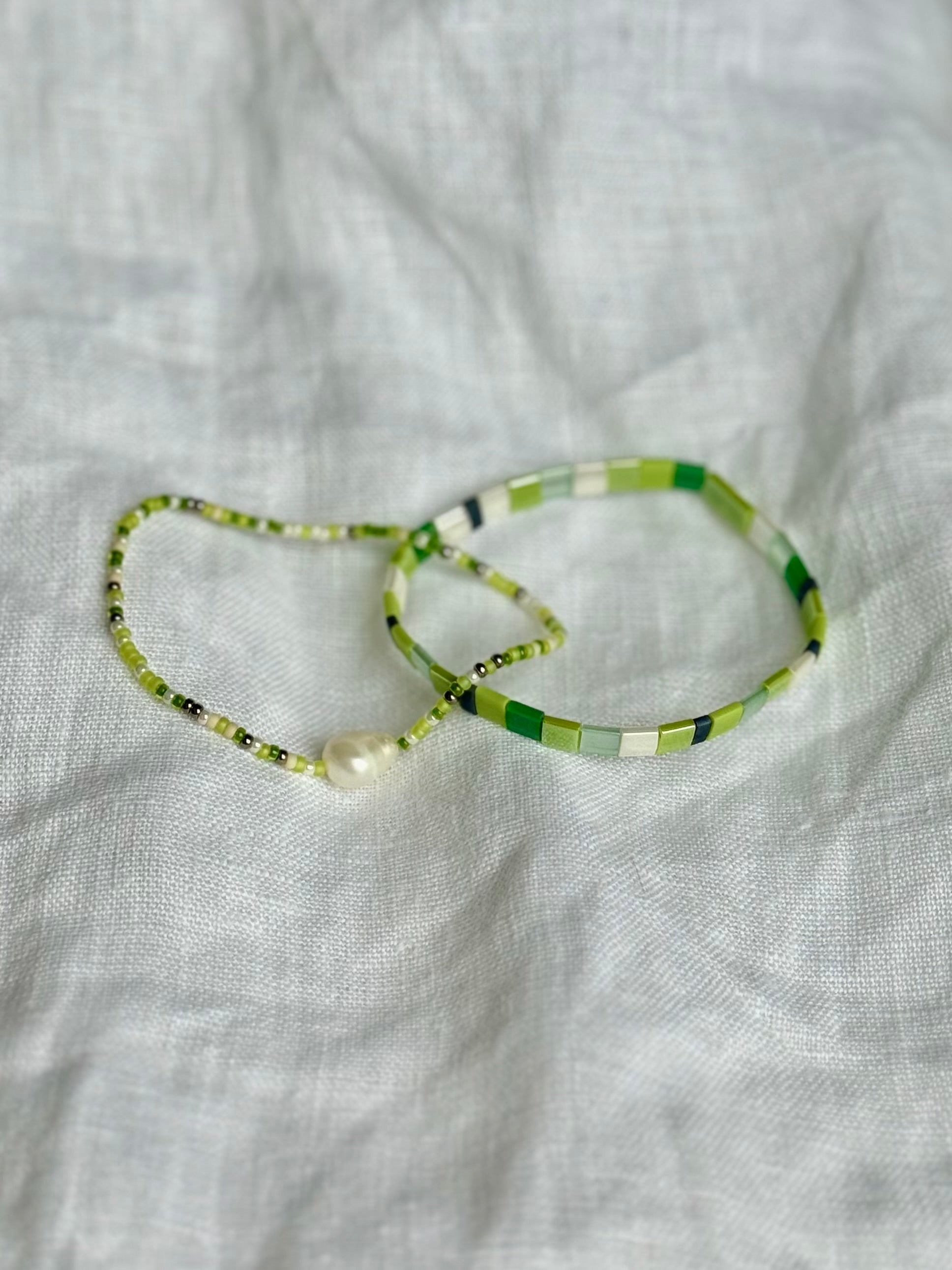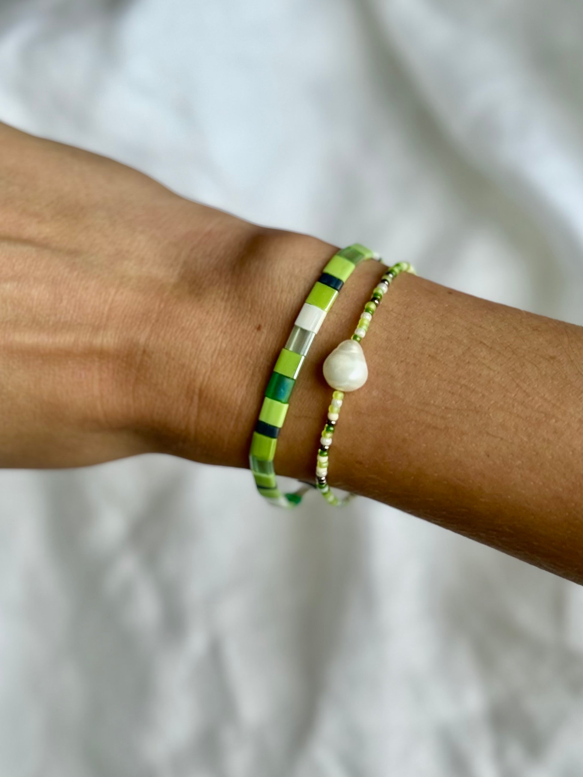 Dvojice náramků Zeleň ve svěže zelených barvách spojuje precizní japonské skleněné korálky Myiuki s krásnou perlou.