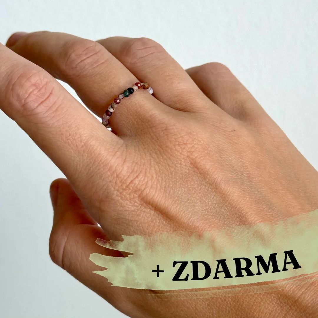 Ke náramku z kolekce Rozverná přidáváme malý kousek radosti navíc – jednoduchý prstýnek z mixu minerálních kamínků. Univerzální velikost, která padne každé ruce.