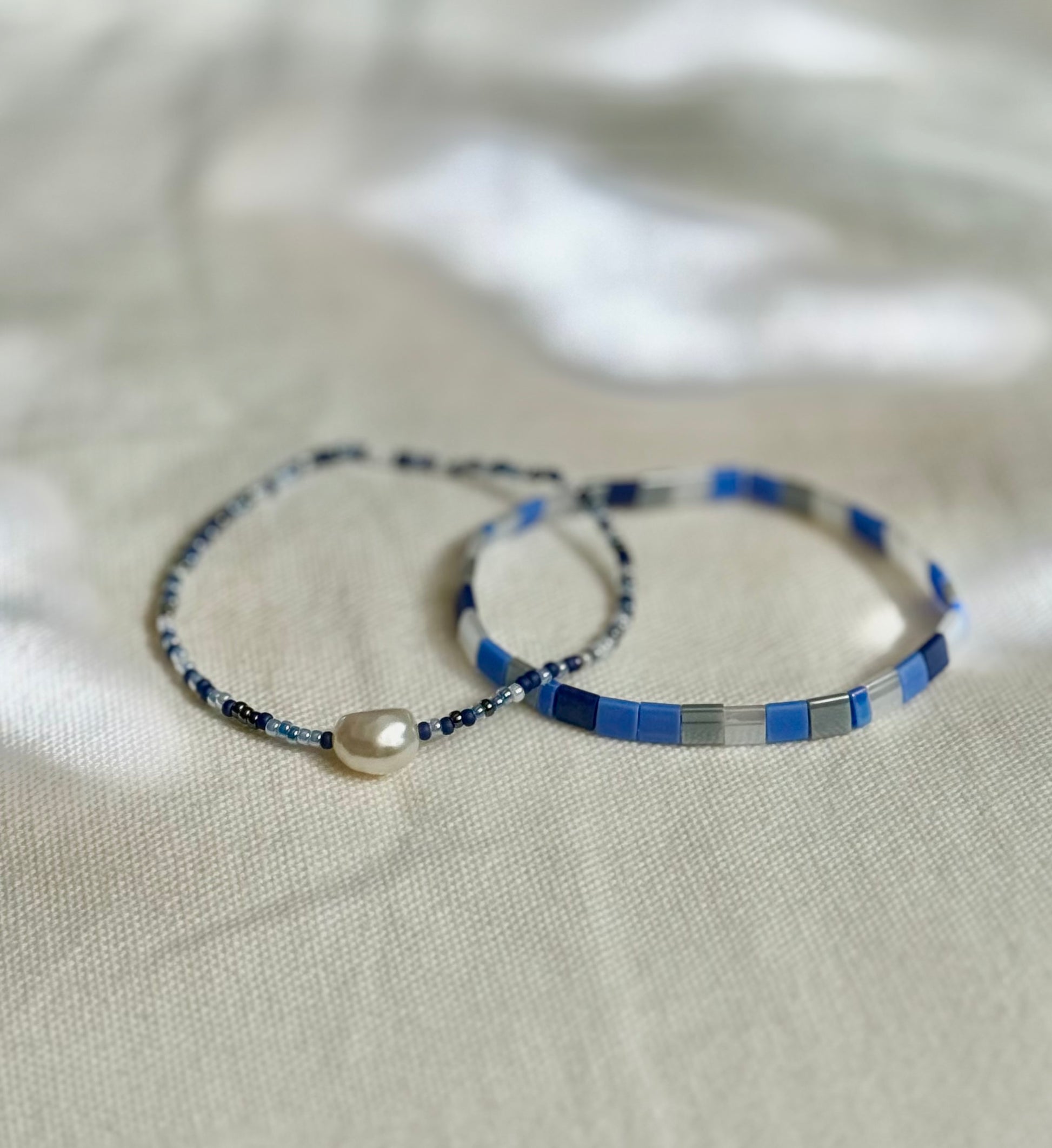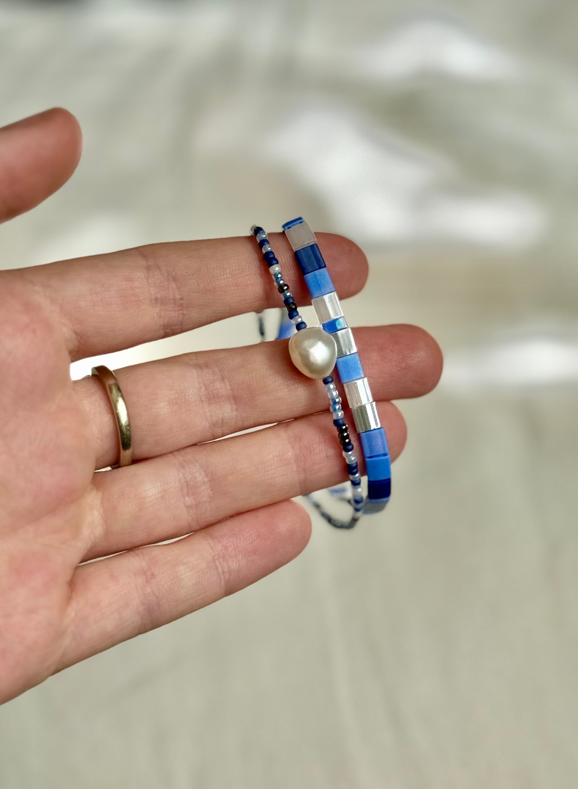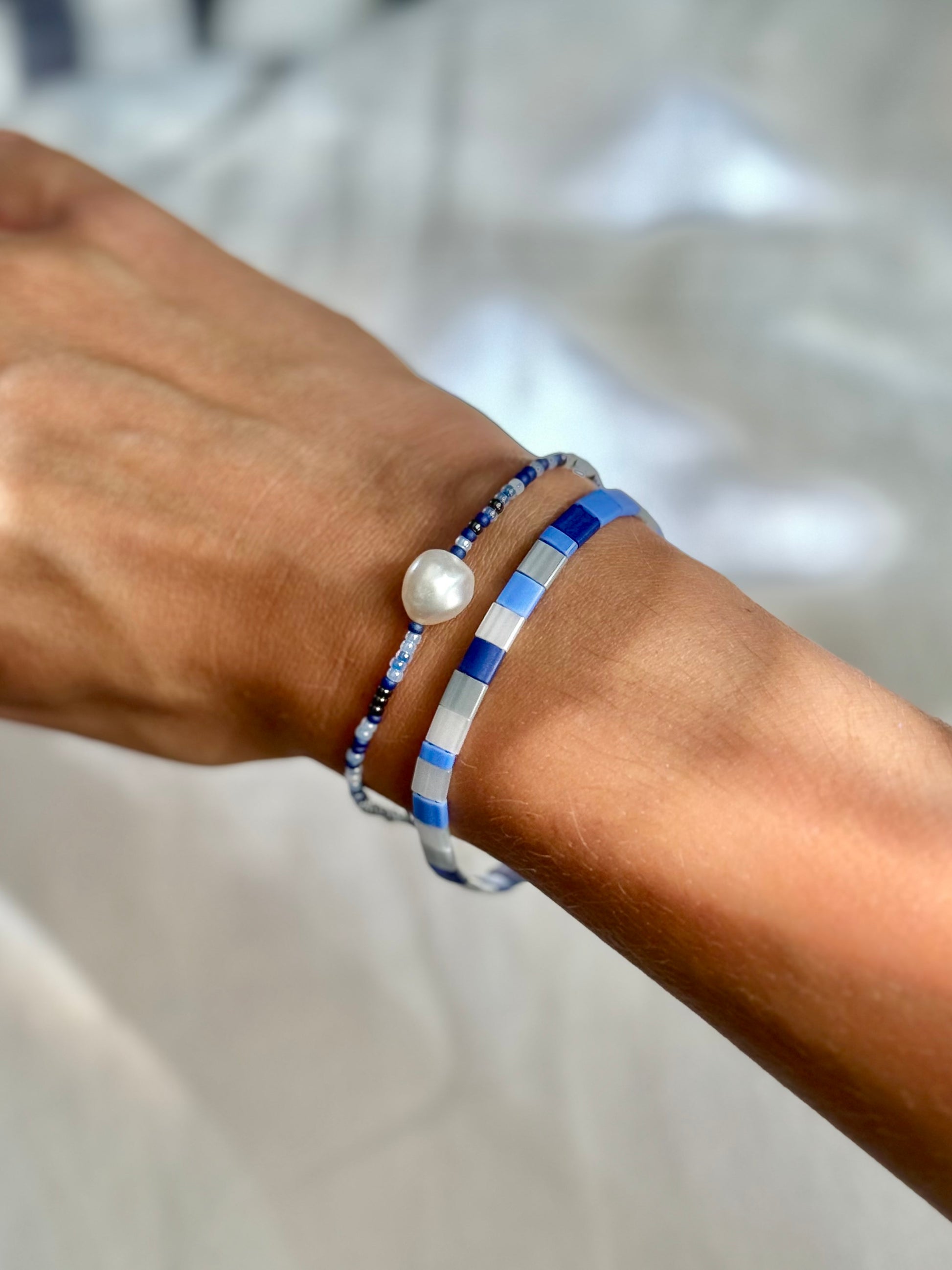 Tato dvojice náramků AZURO laděná do krásných modrých azurových odstínů spojuje precizní japonské skleněné korálky Myiuki s krásnou perlou.