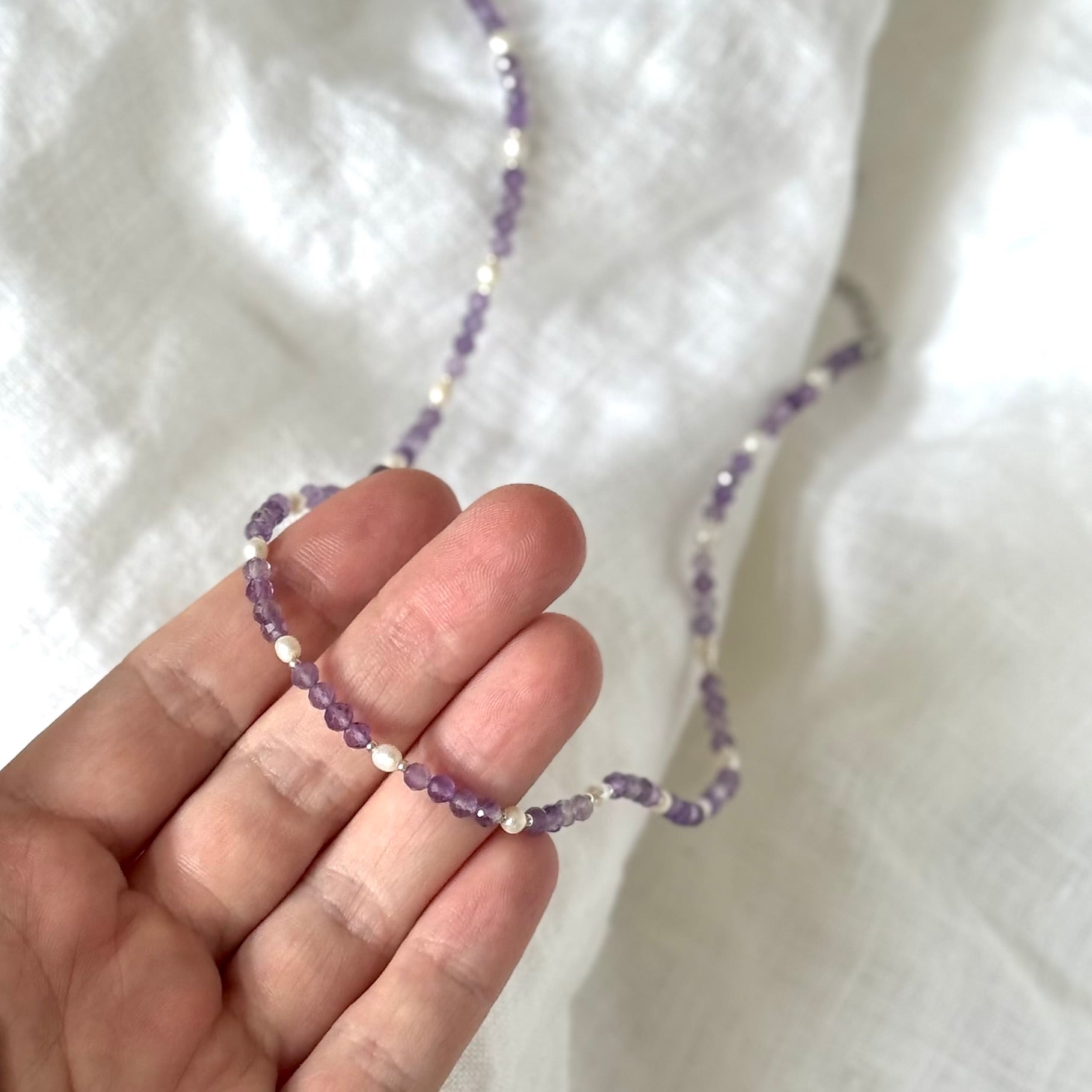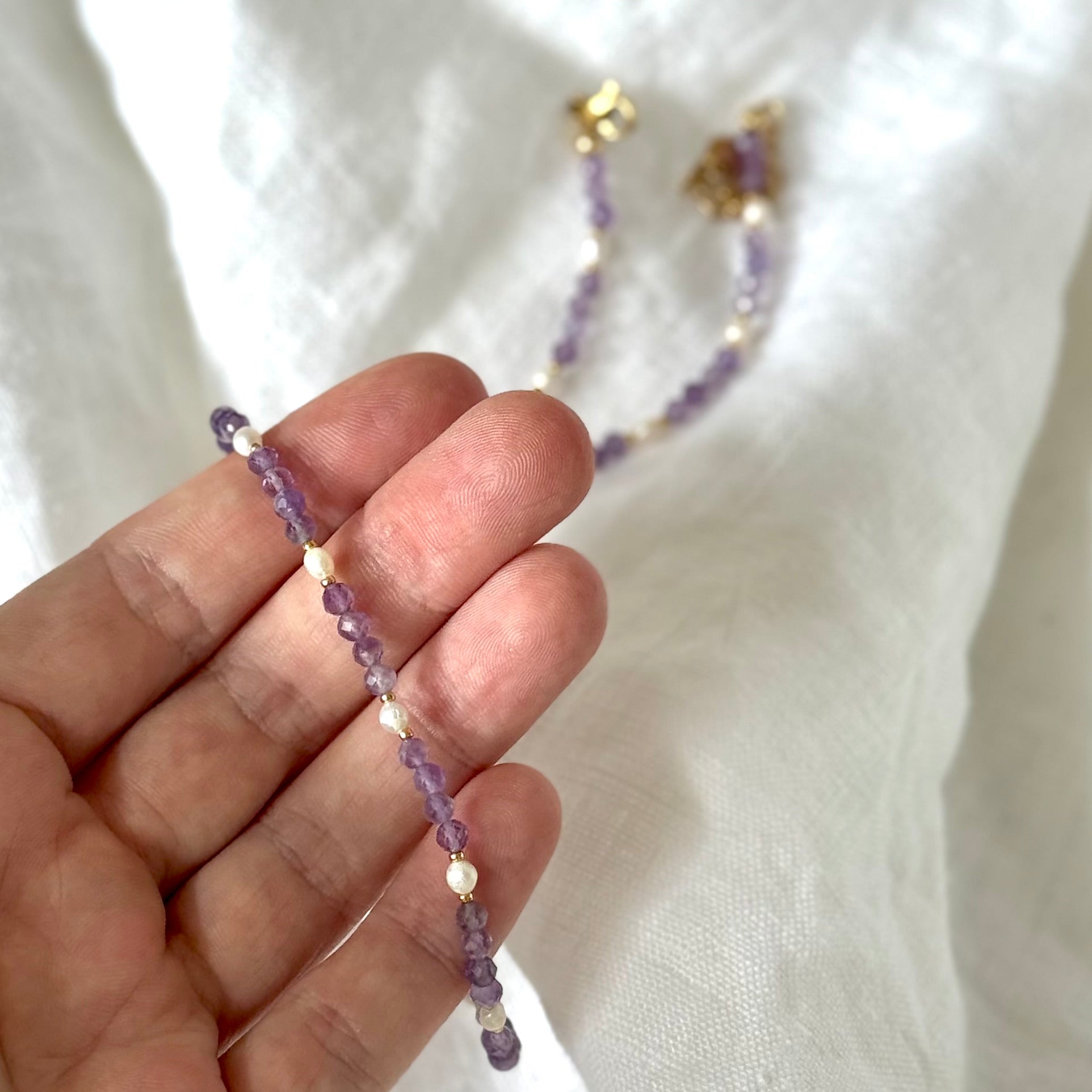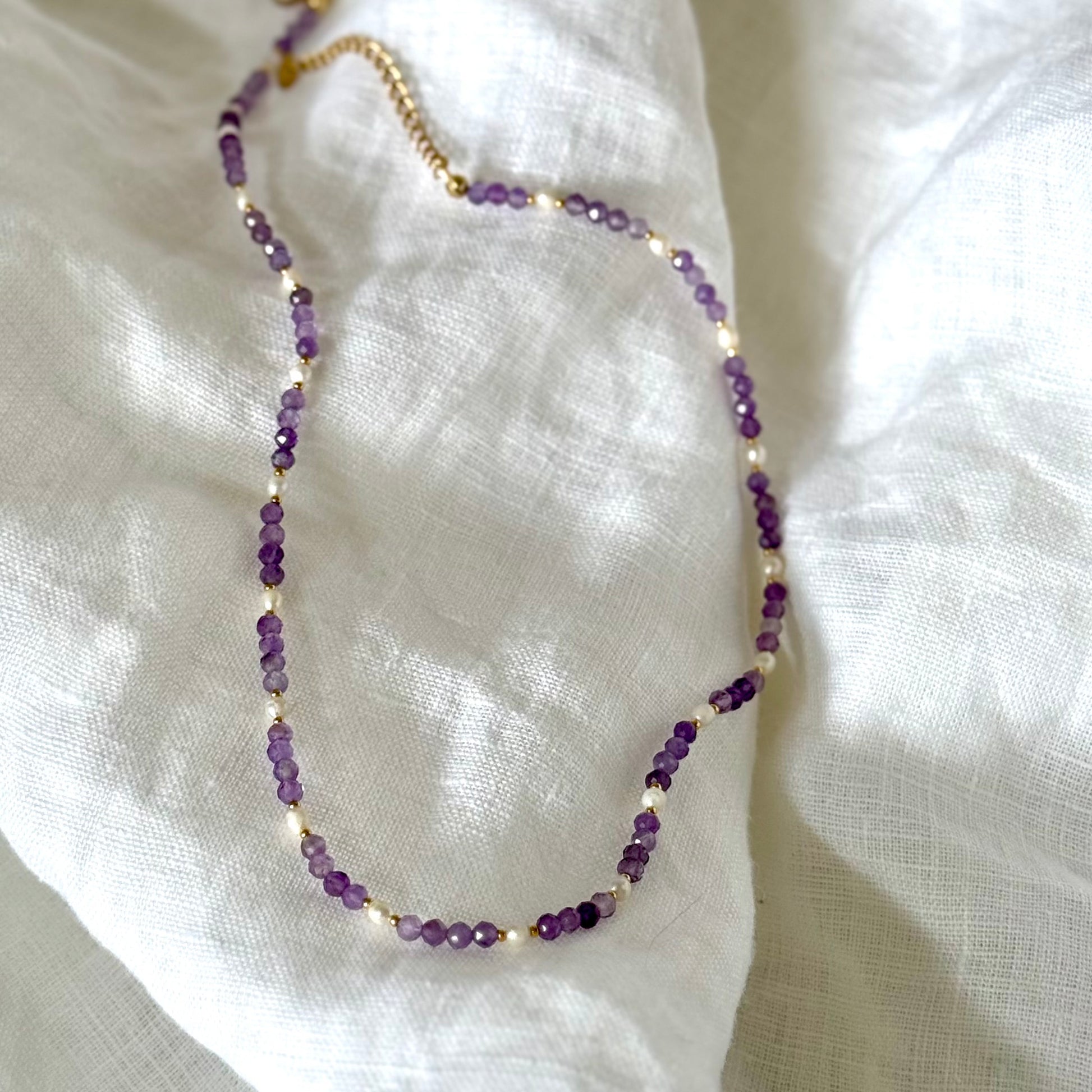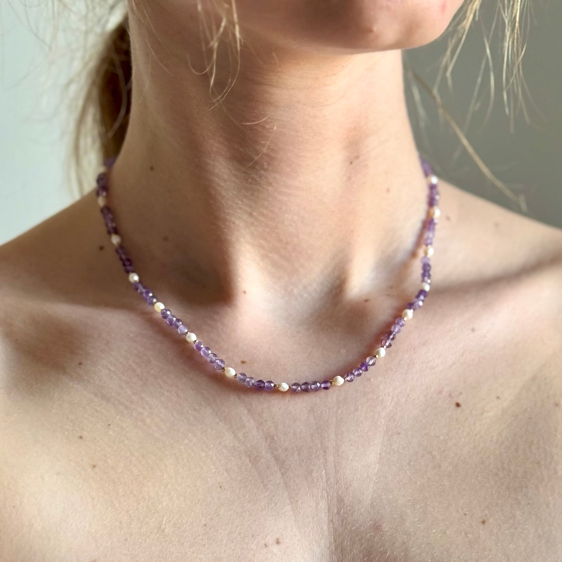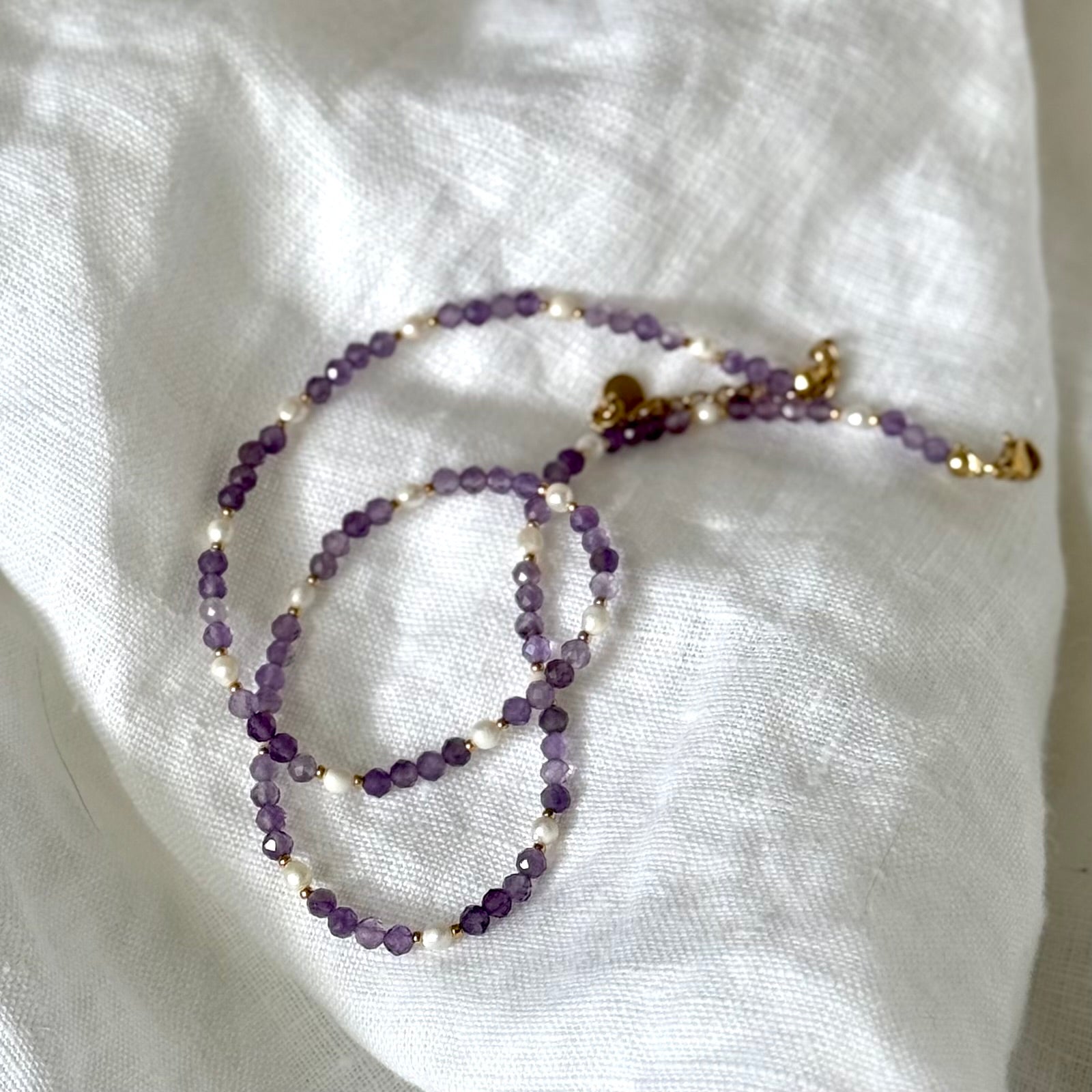Fialové tóny ametystu vnášejí do každodenního života pocit klidu a harmonie, zatímco perly dodávají náhrdelníku jemnost a sofistikovaný nádech. Skvěle se hodí jak k běžnému nošení, tak k výjimečným příležitostem – podtrhne vaši osobnost a dodá každému outfitu výjimečný detail.