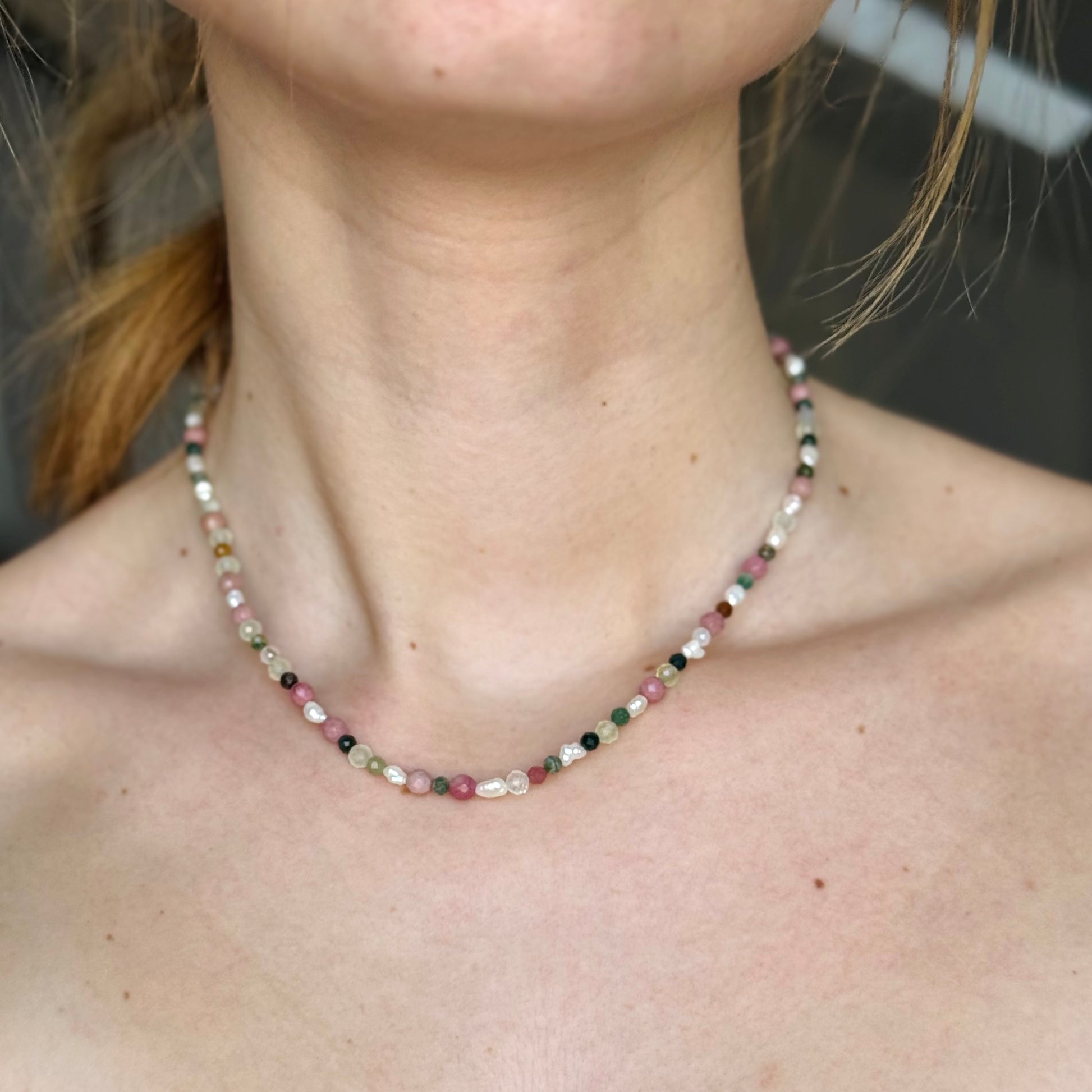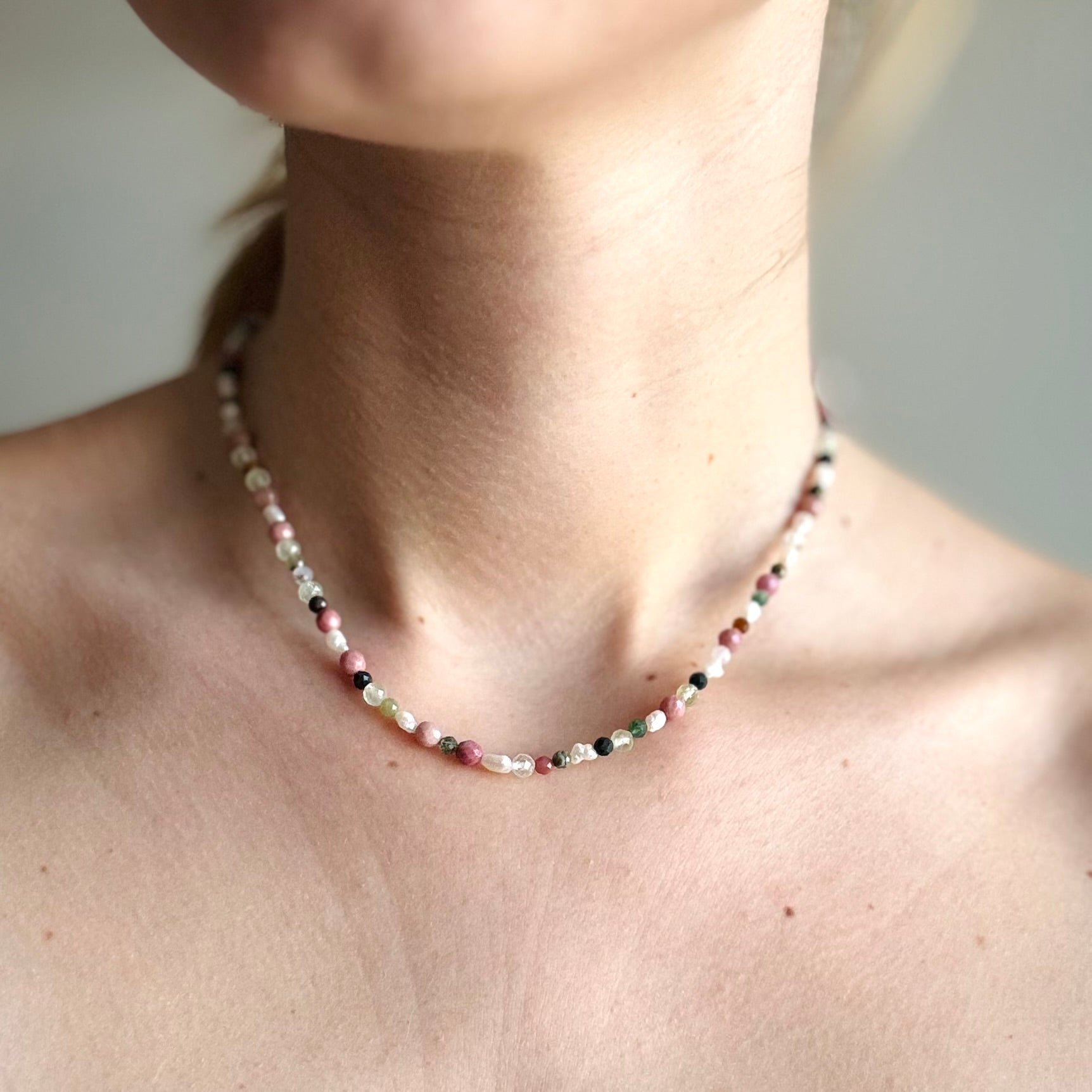 Náhrdelník MAGNOLIE z uhrančivé kombinace rodonitu, achátu, prehnitu a říčních perel.