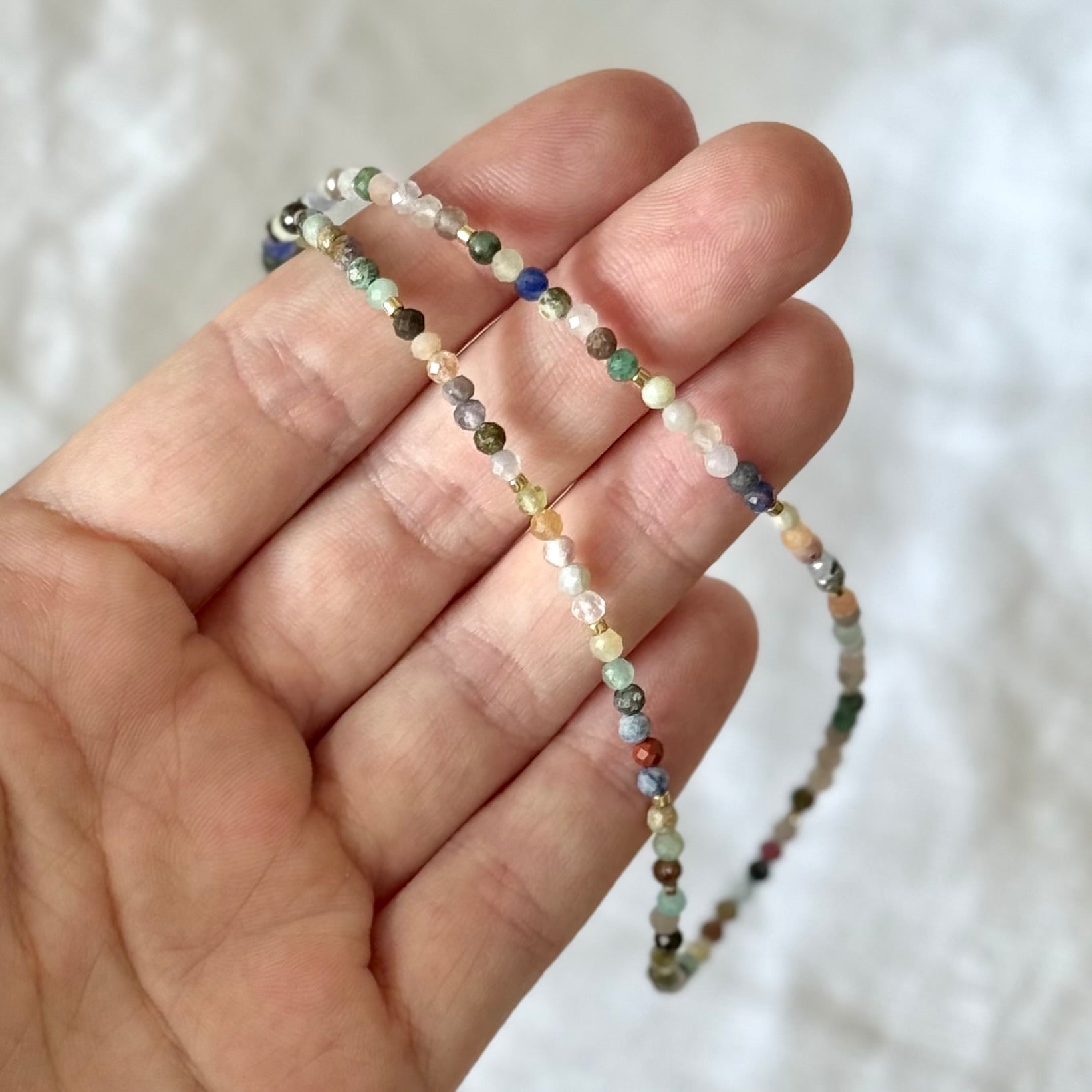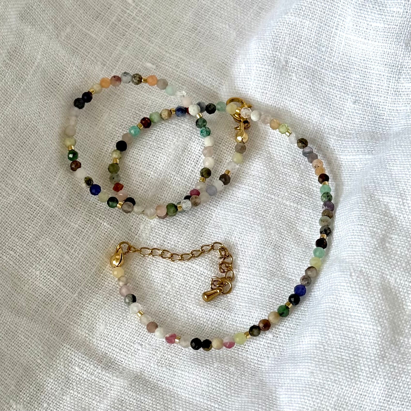 Barevné kamínky zaujmou svou třpytivostí i rozmanitostí – jako by v sobě nesly kousek léta, volnosti a dobré nálady. Skvěle se hodí k vrstvení, ale vynikne i samostatně jako šperk, který rozzáří i ten nejjednodušší outfit.