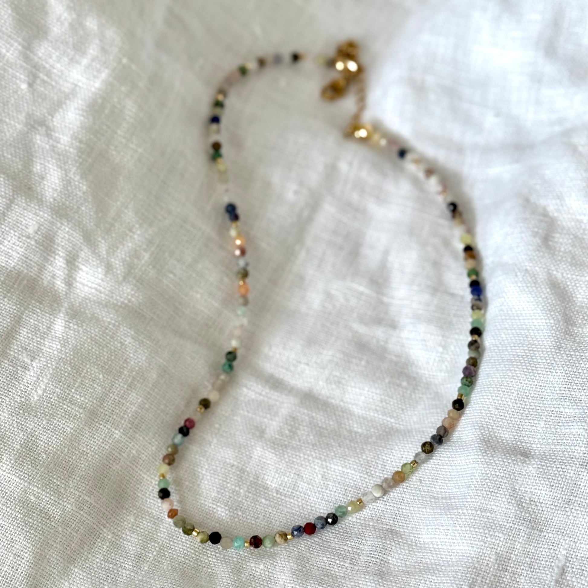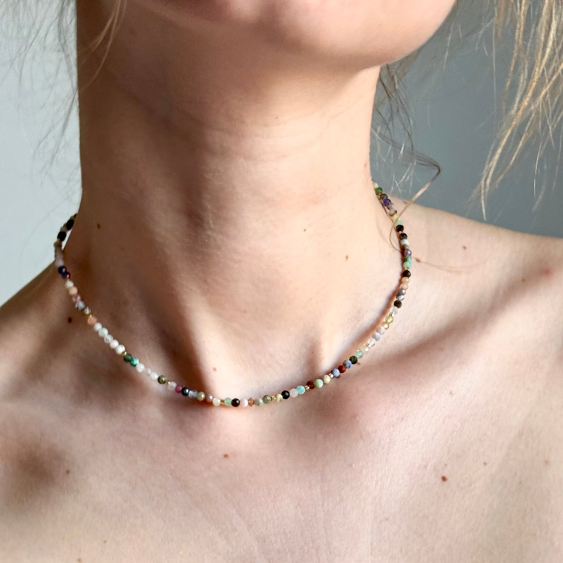 Náhrdelník MIX je radost v podobě šperku. Kombinuje drobné, broušené minerální kameny v pestré paletě barev s jemnými pozlacenými nebo postříbřenými skleněnými korálky. Každý kousek je jedinečný a přináší hravou, optimistickou energii.