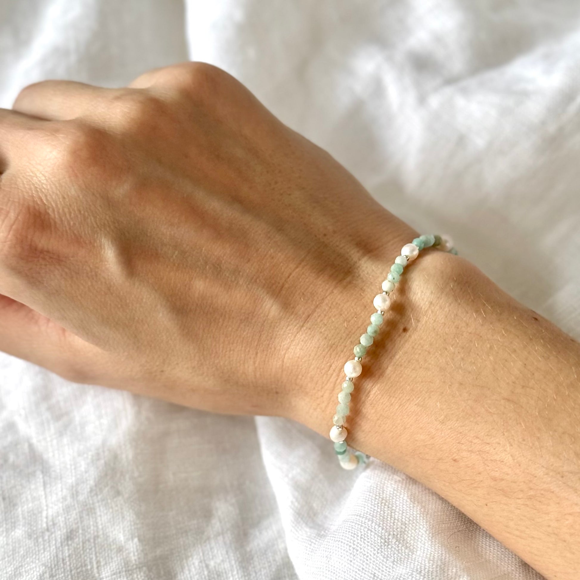 Náramek Amaze spojuje jemné modrozelené tóny broušeného amazonitu s pravými sladkovodními perlami, čímž vytváří svěží a elegantní šperk, který se hodí pro každodenní nošení i speciální příležitosti.