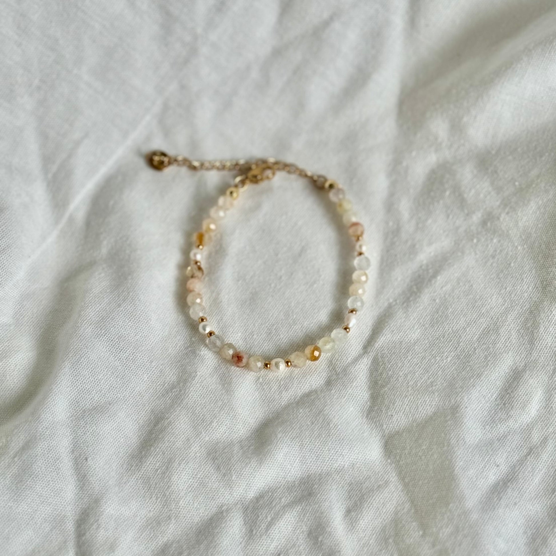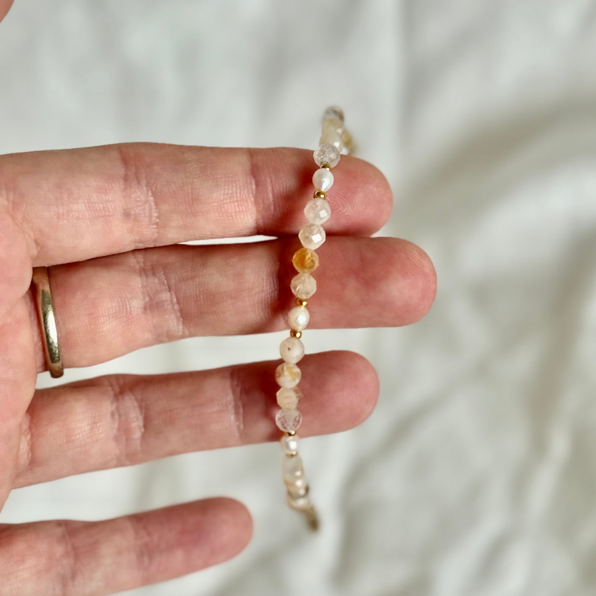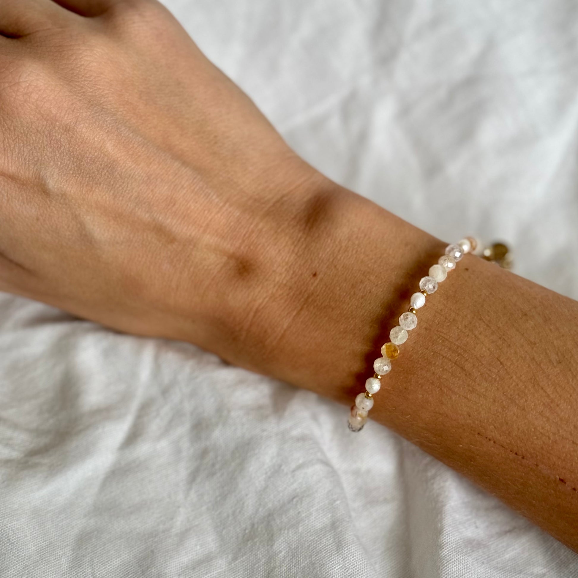 Citrín je ceněn pro svou zářivou zlatou barvu, která symbolizuje energii a optimismus, zatímco perly dodávají náramku jemnou nadčasovou eleganci.