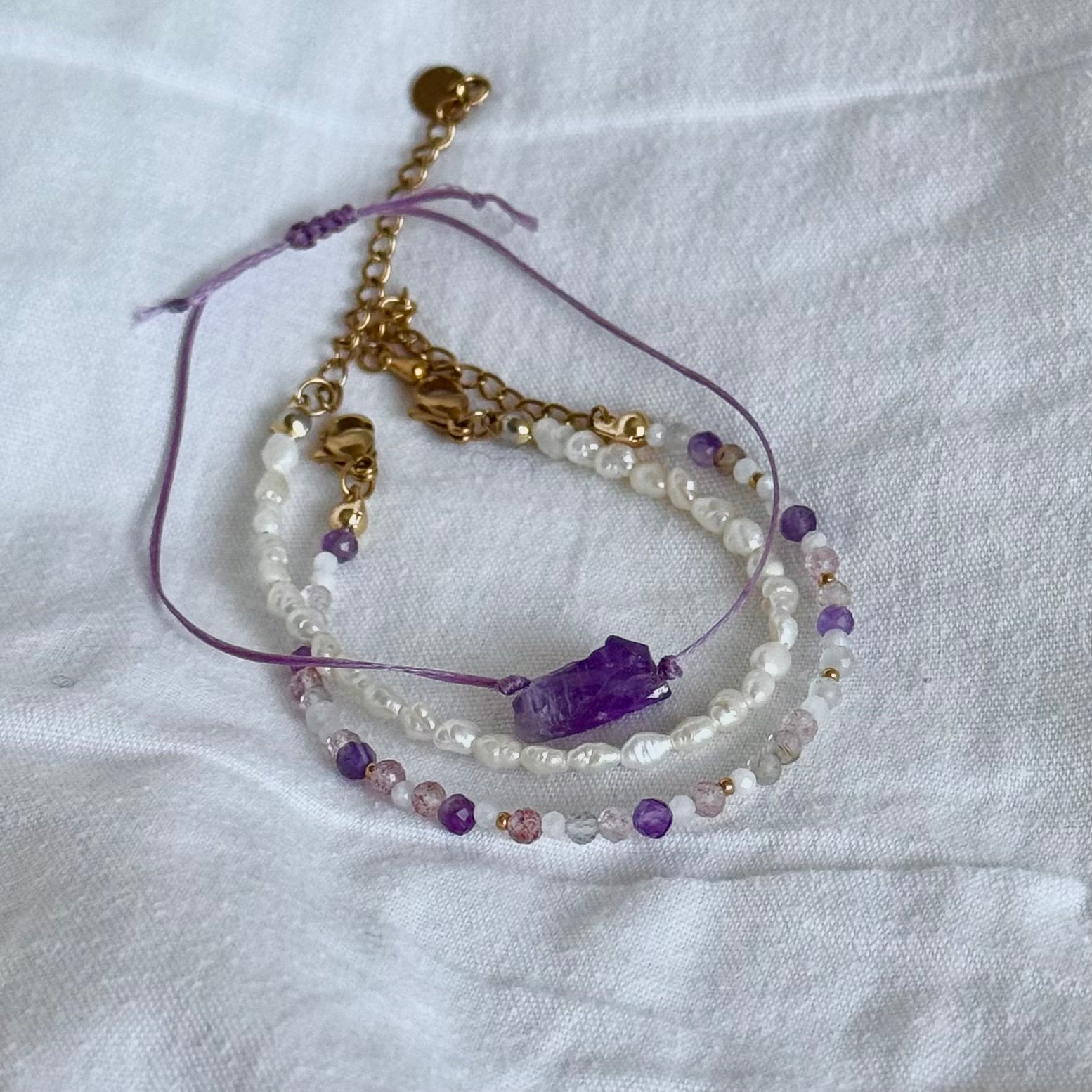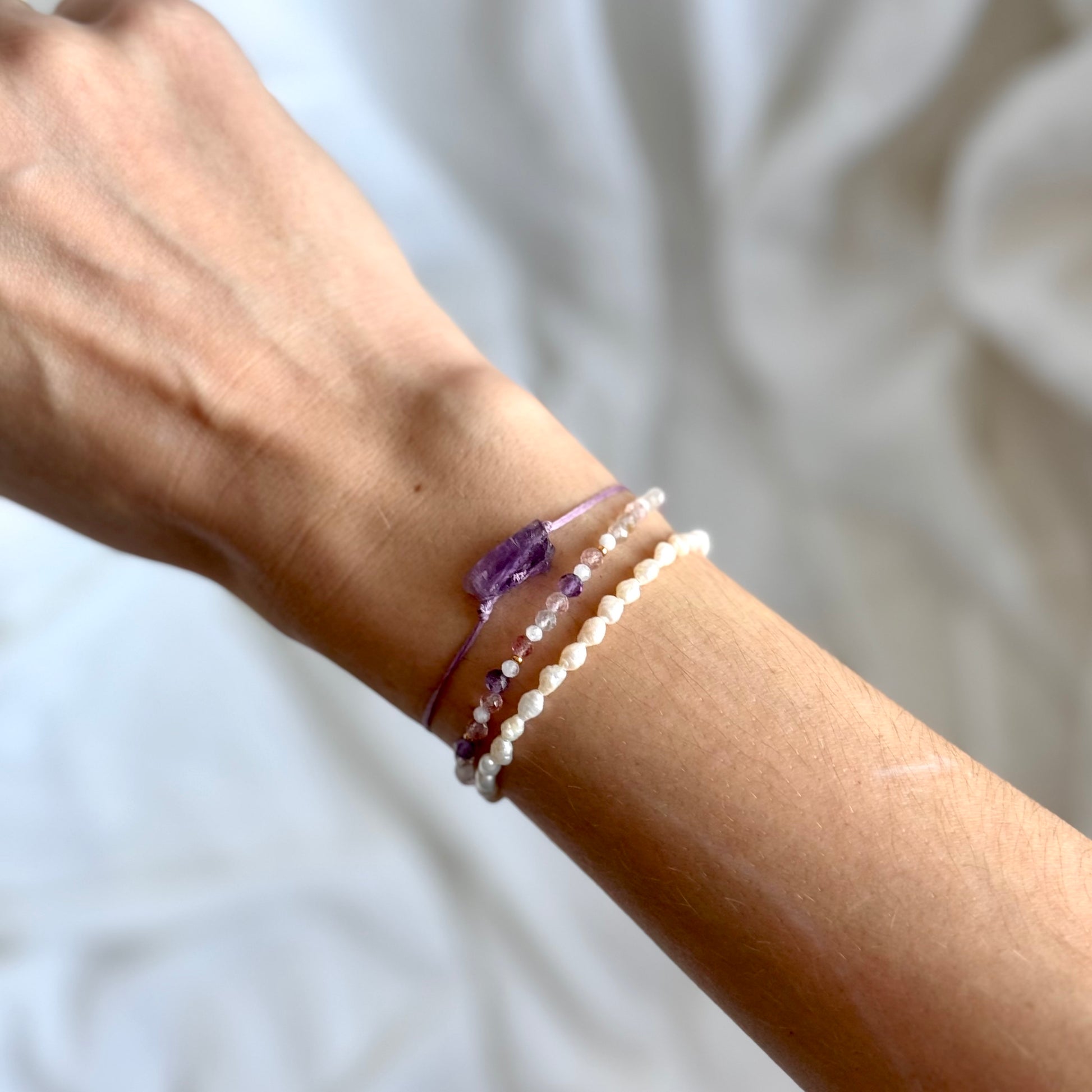 Náramky sladěné do fialova se surovým ametystem na šňůrce, náramkem z kombinace růženínu, ametystu, citrínu a měsíčního kamene se stříbrem či zlatem pokovenými skleněnými korálky a s perlovým náramkem s malých říčních perel