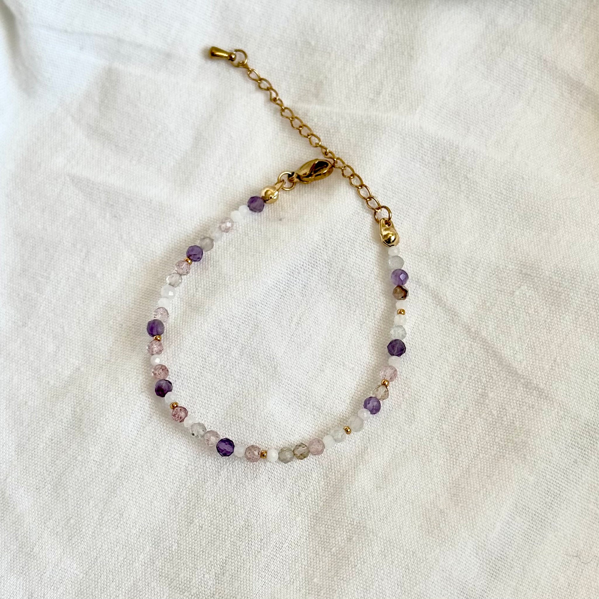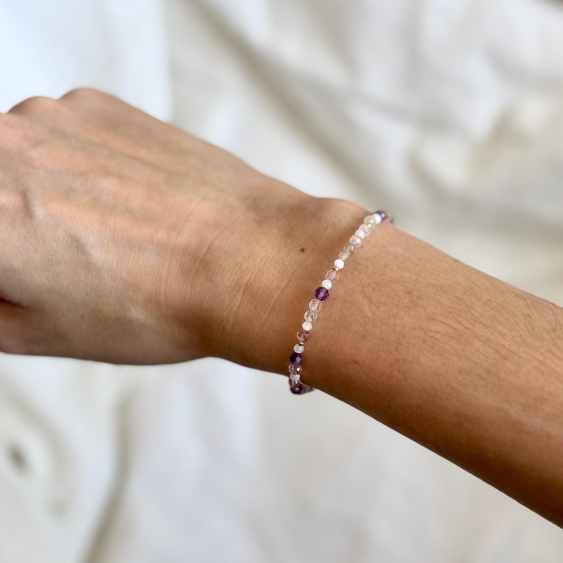 Náramek z nádherné něžné kombinace růženínu, ametystu, citrínu a měsíčního kamene se stříbrem či zlatem pokovenými skleněnými korálky.