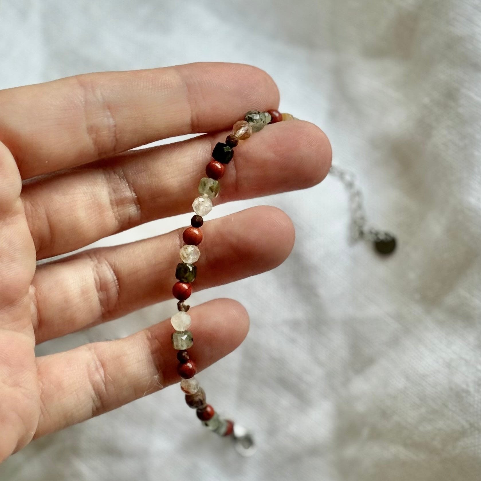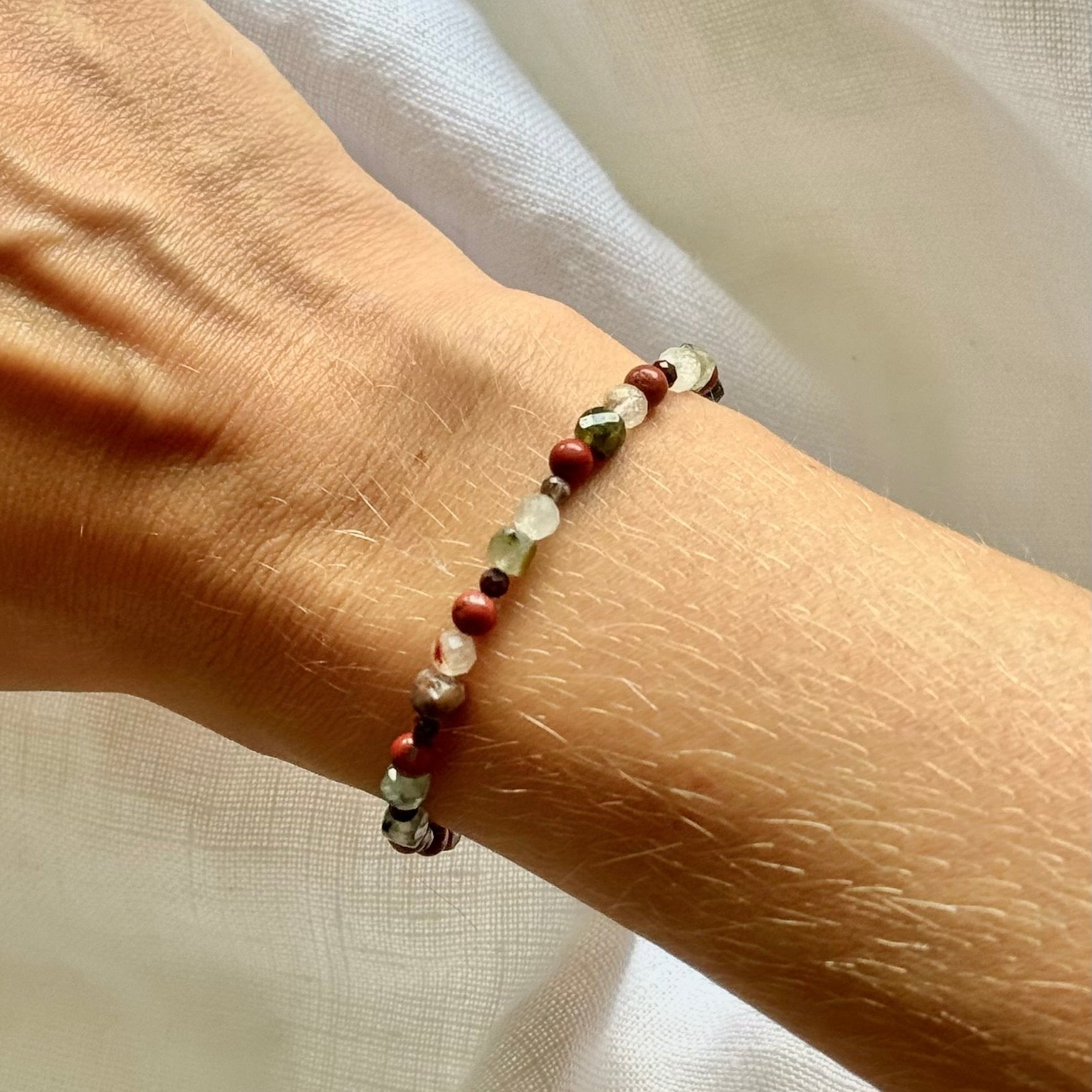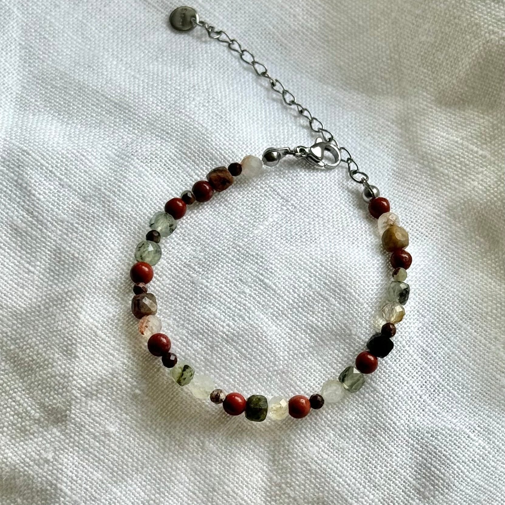 Náramek Útulno přináší příjemnou kombinaci červeného jaspisu, broušeného prehnitu, fluoritu, citrínu a chryzoprasu.