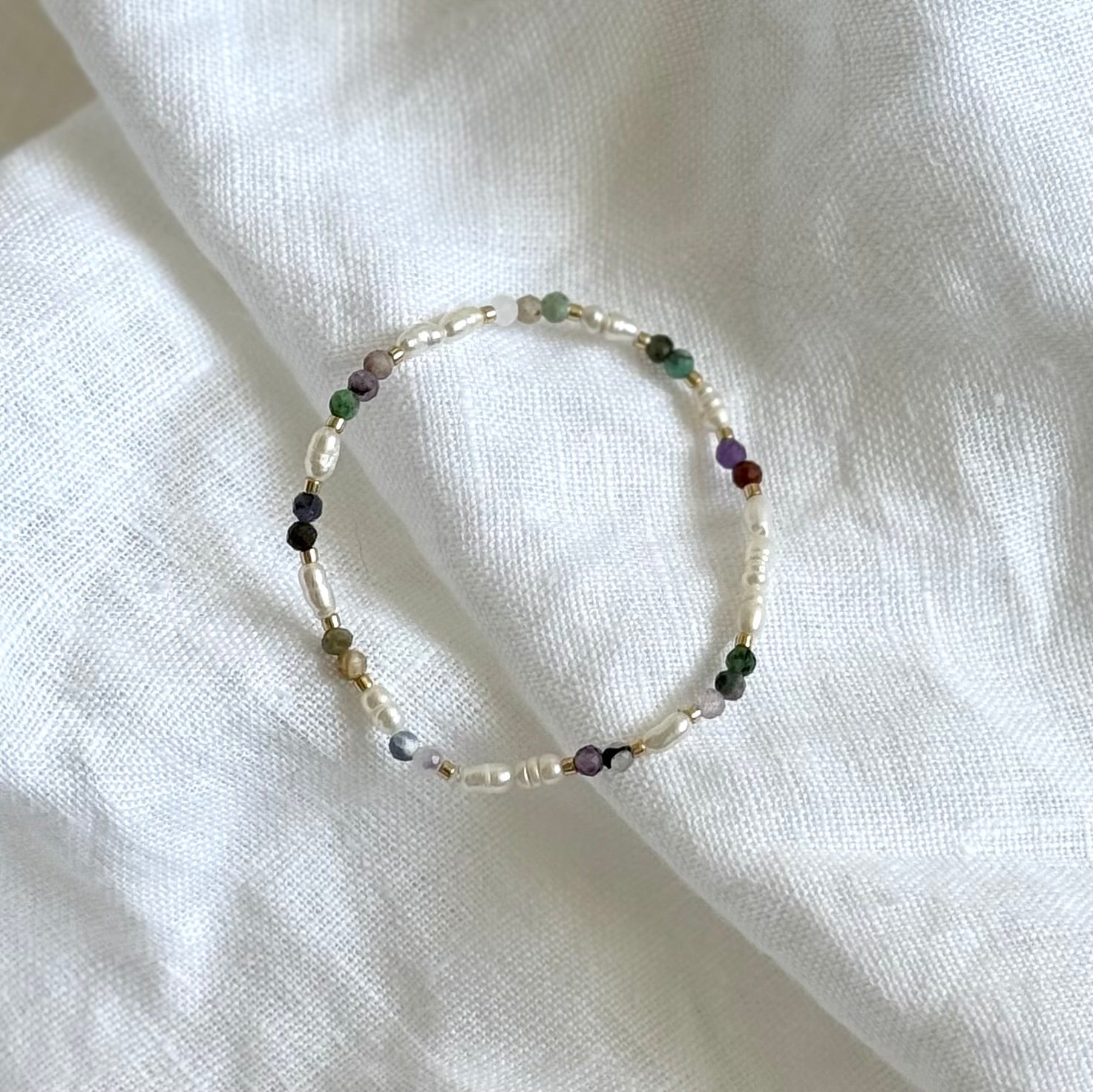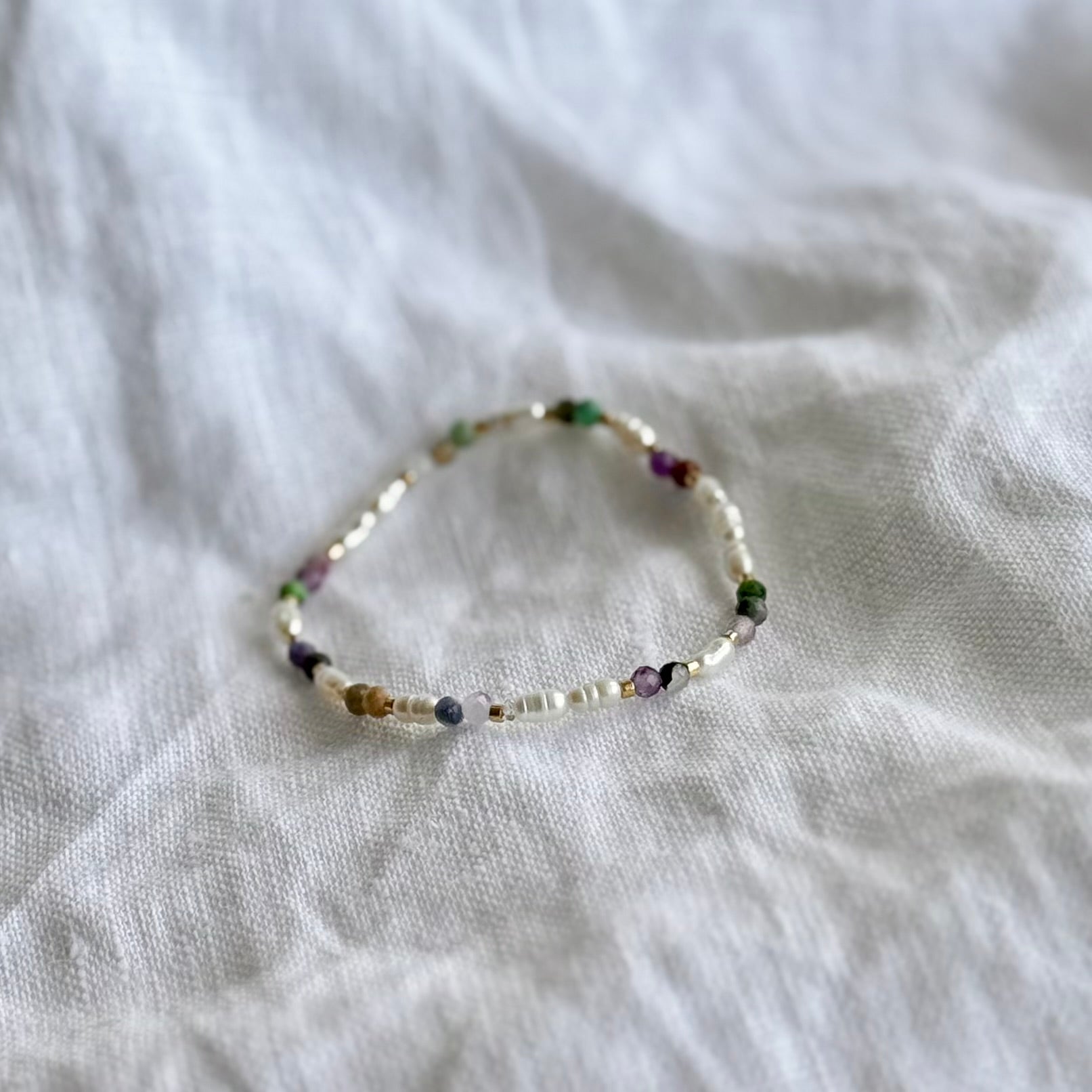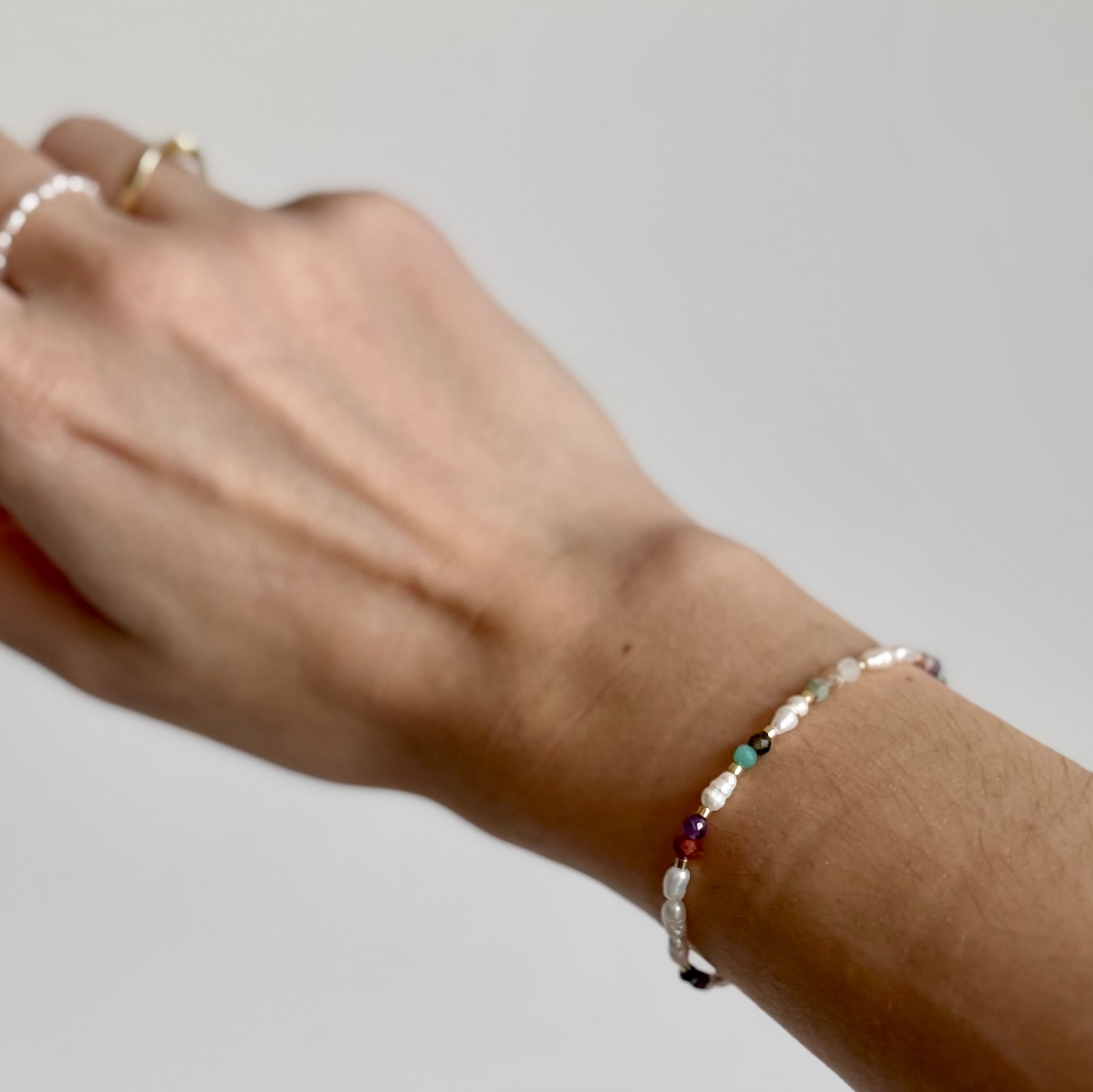 📌 Materiál: mix přírodních minerálů (3 mm, broušené korálky), sladkovodní perly (2–3 mm), odolná pruženka, skleněné korálky pokovené pravým stříbrem nebo zlatem