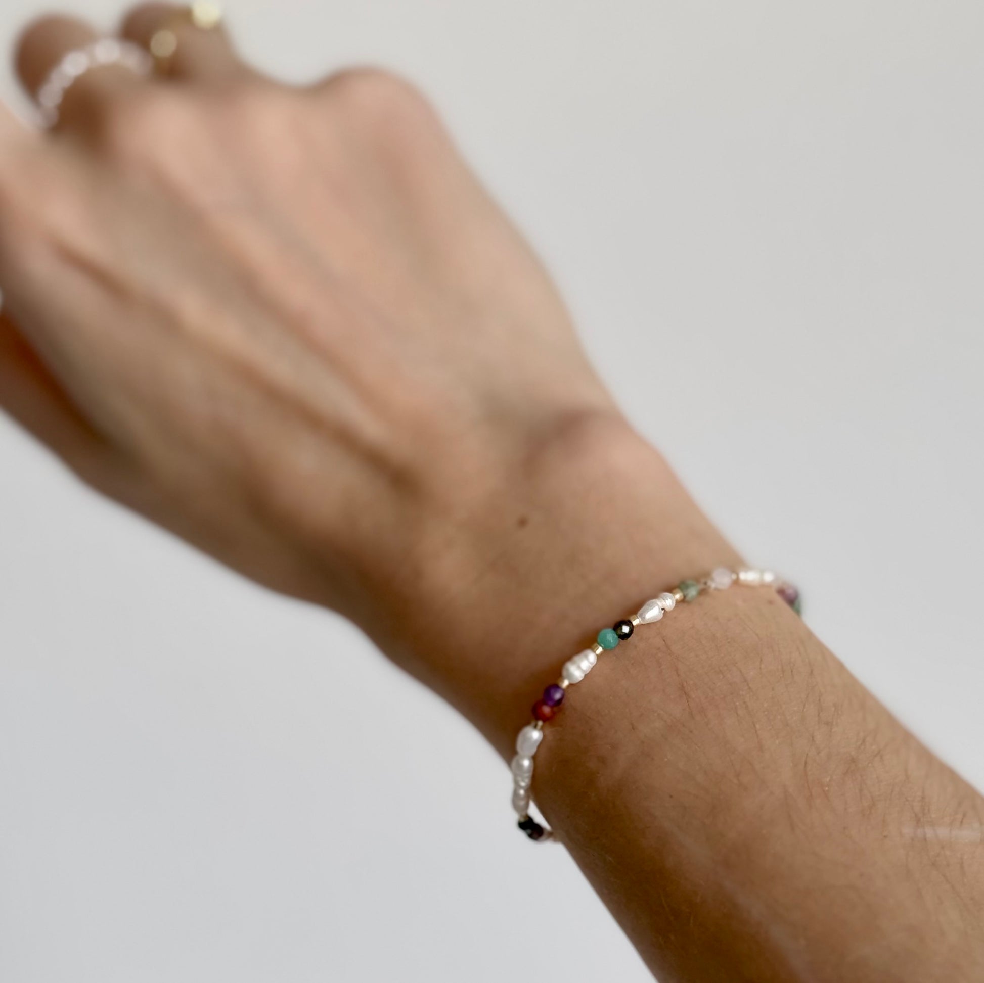 Perly, minerály a zářivé detaily – tři prvky, které se v tomto náramku snoubí v dokonalé harmonii.