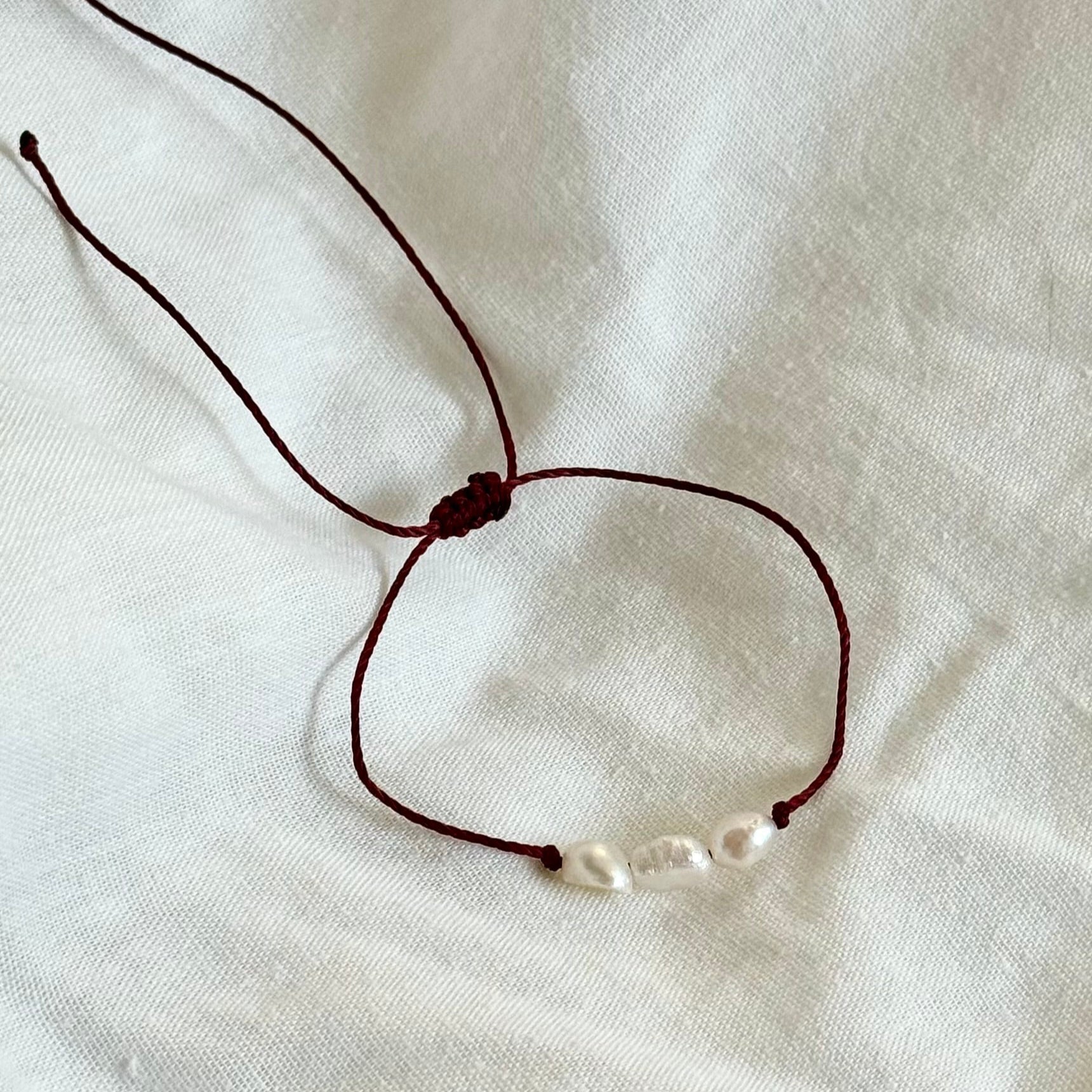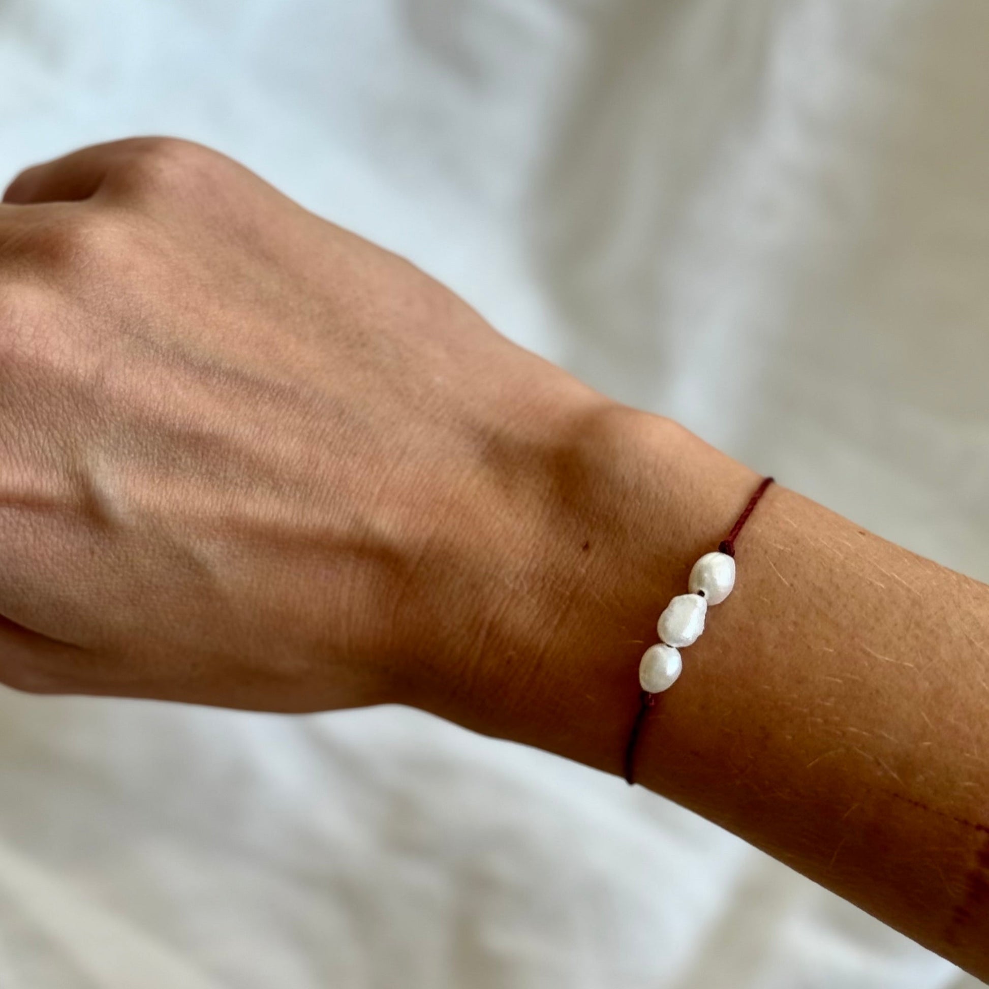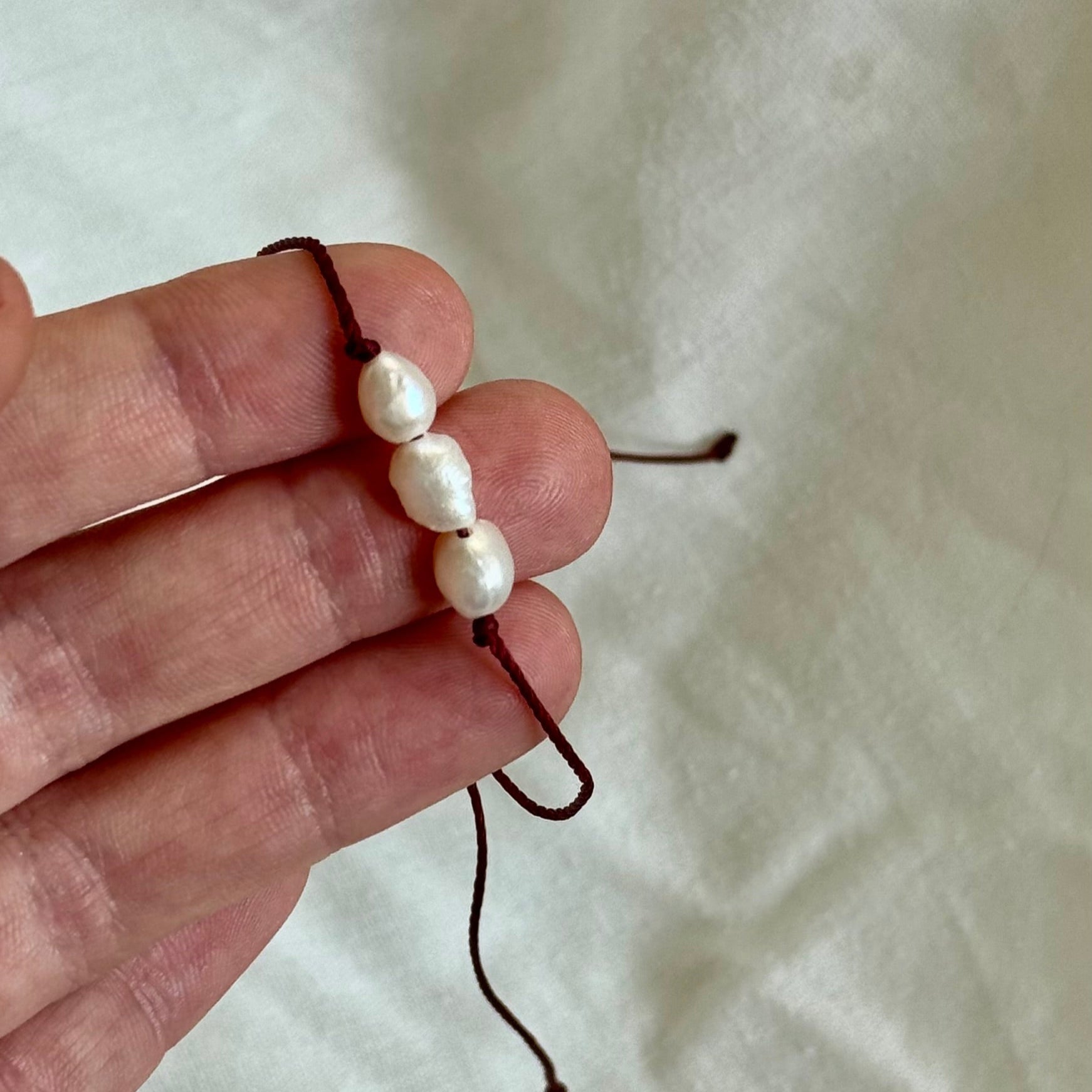 Tento elegantní náramek spojuje tři pravé říční perličky zajímavých tvarů s kvalitní povoskovanou šňůrkou.
