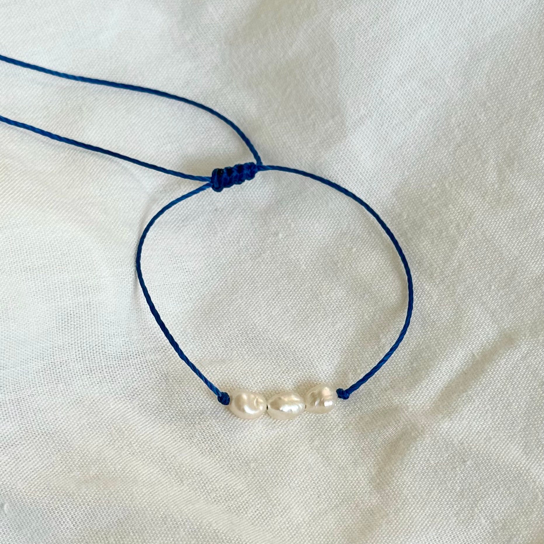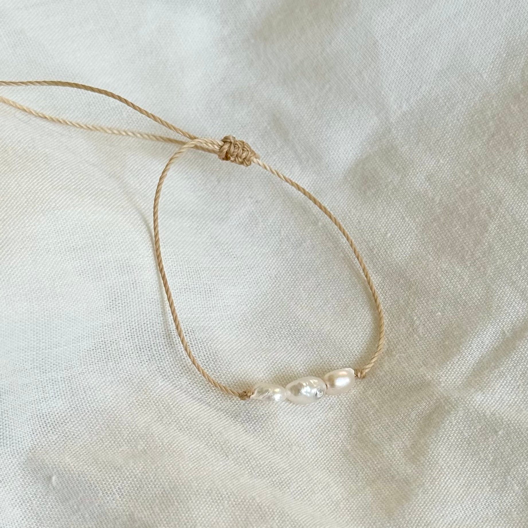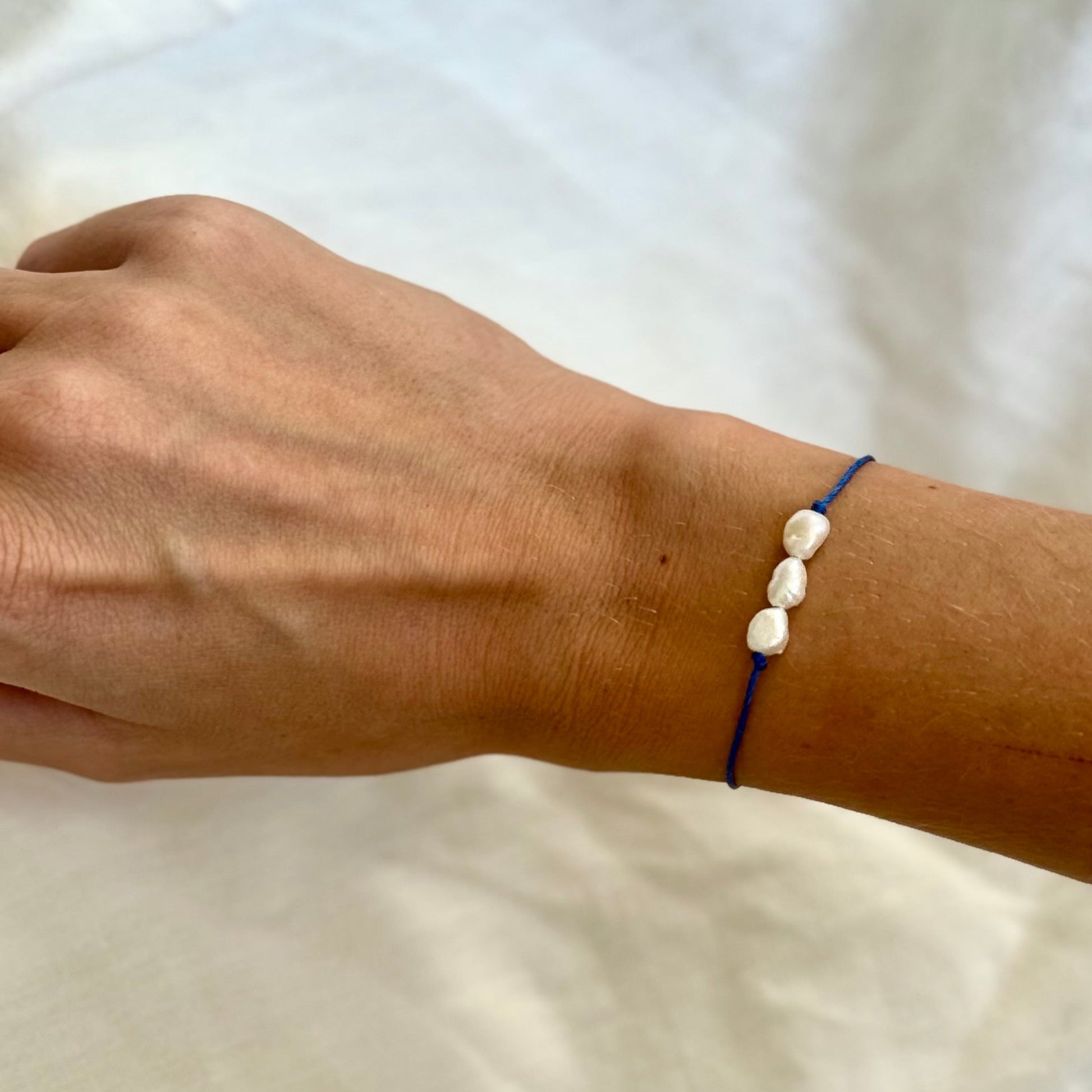 Tento elegantní náramek spojuje tři pravé říční perličky zajímavých tvarů s kvalitní povoskovanou šňůrkou.