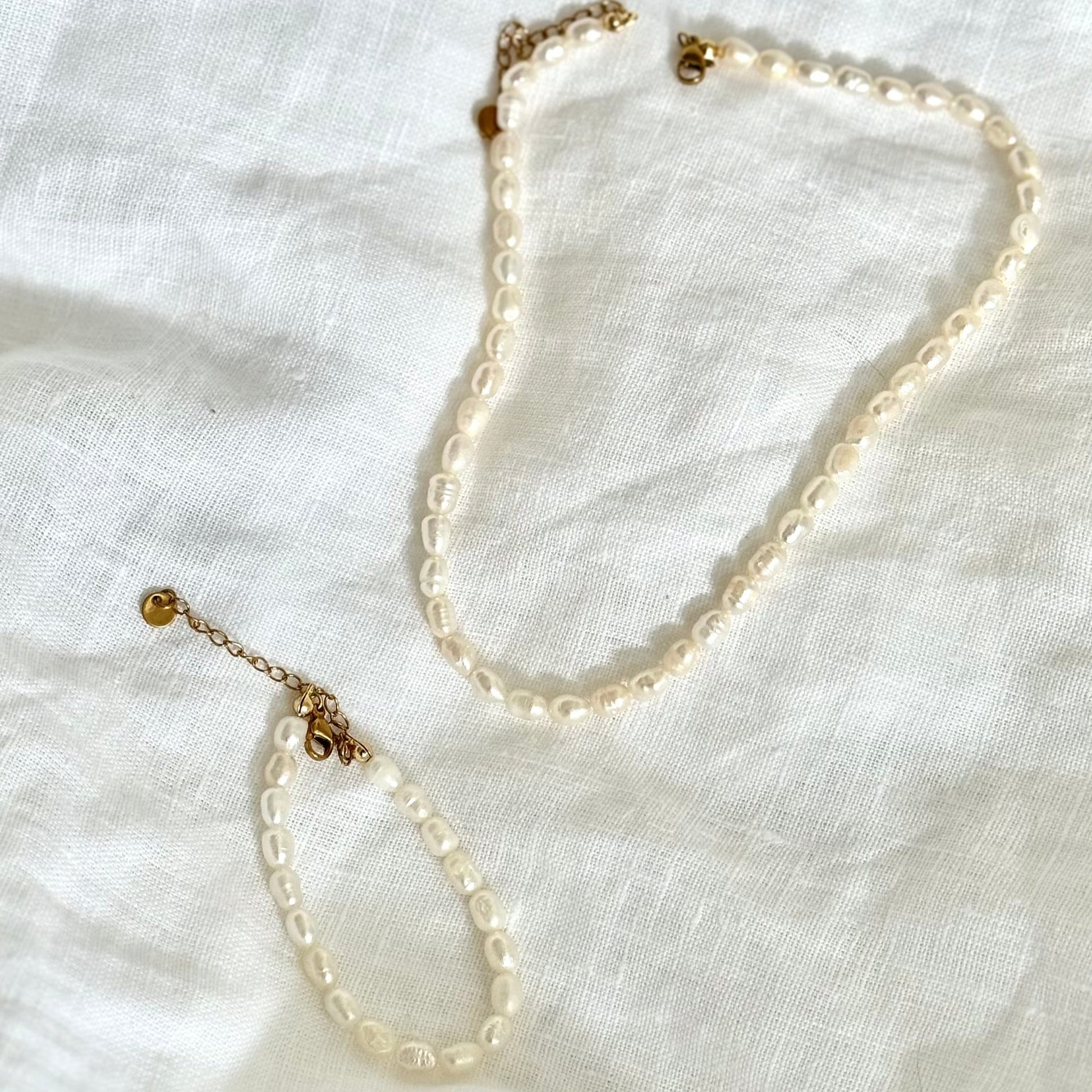Náhrdelník a náramek Klasa ze středně velkých říčních perel o velikosti 5-6 mm je elegantní volbou pro každodenní nošení i speciální příležitosti.
