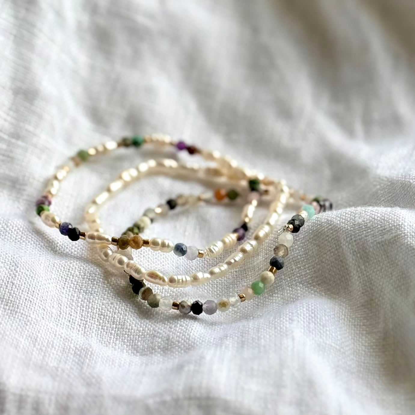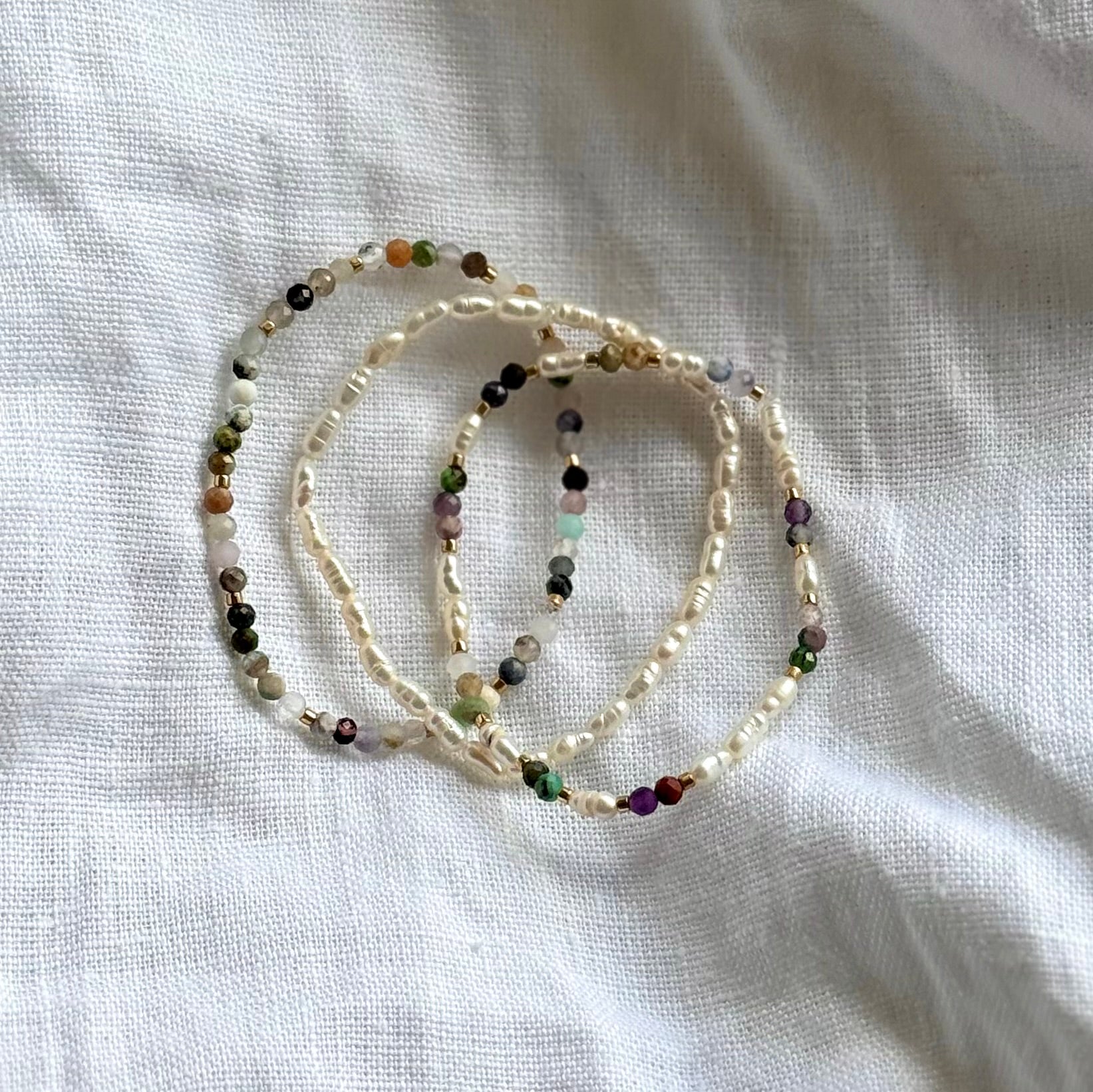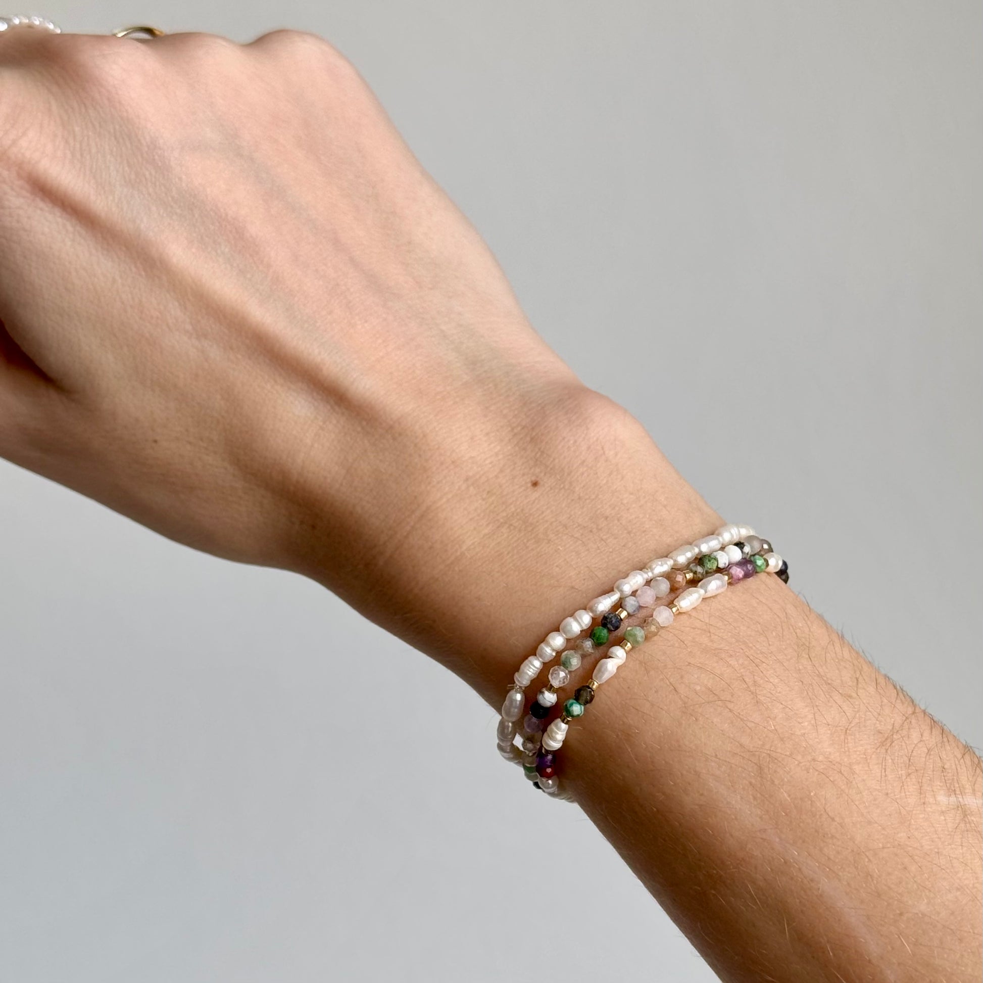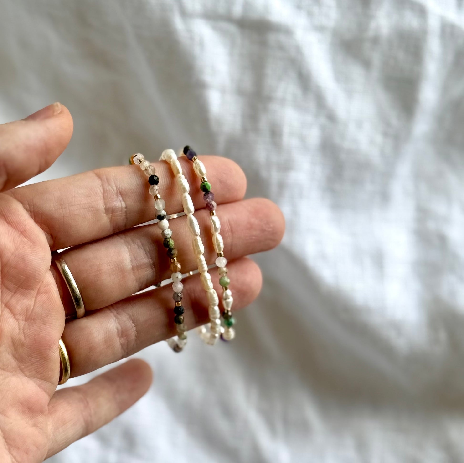 📌 Materiál: sladkovodní perly (2–3 mm), mix přírodních minerálů (3 mm, broušené korálky), odolná pruženka, skleněné korálky pokovené pravým stříbrem nebo zlatem