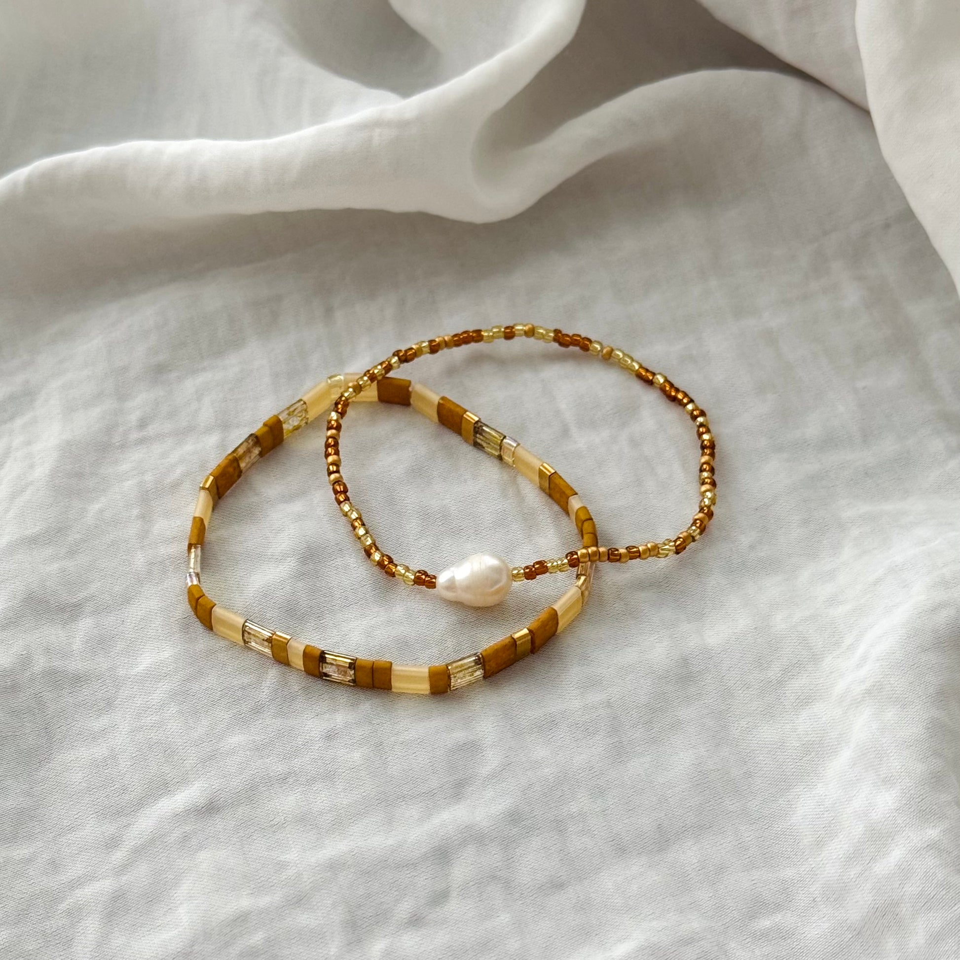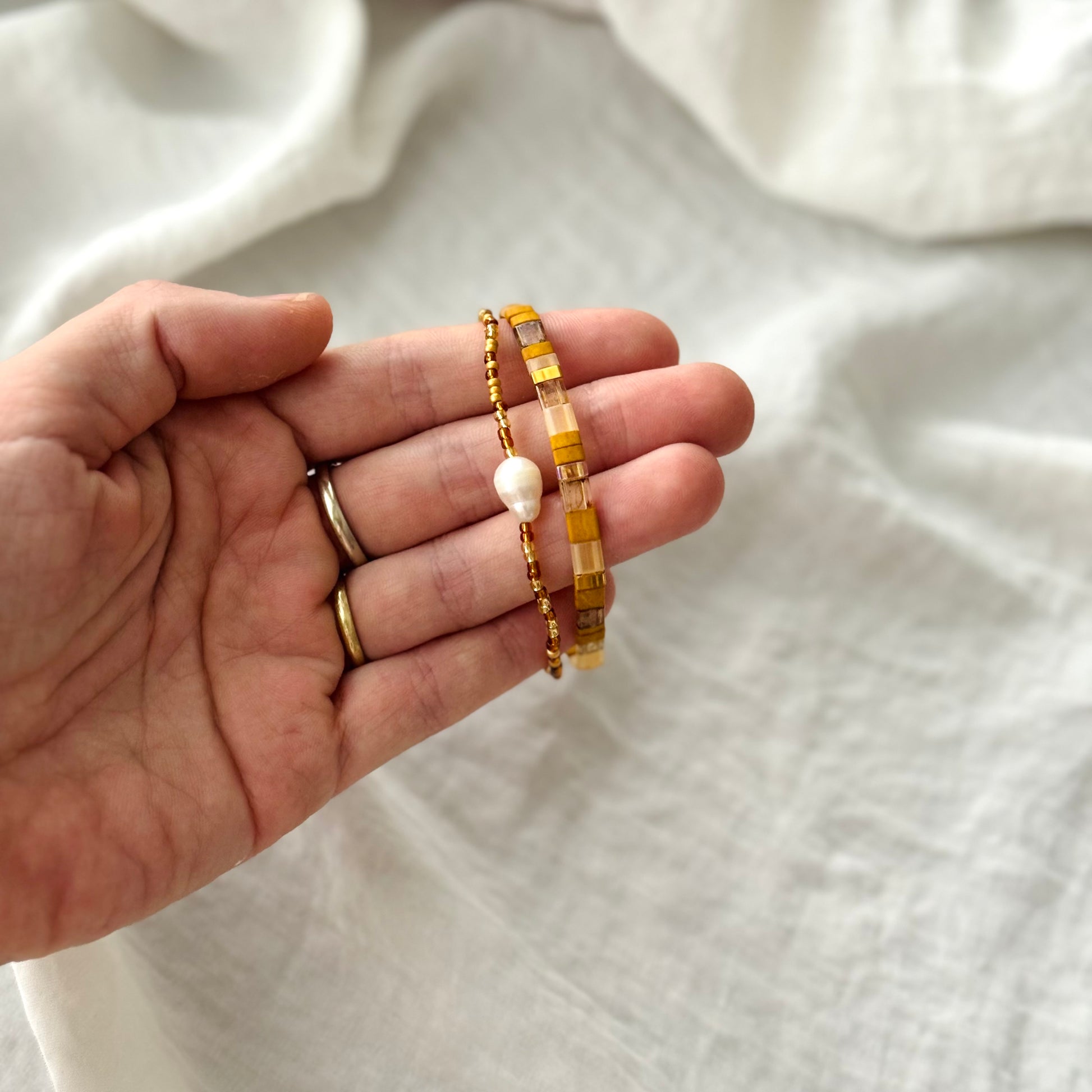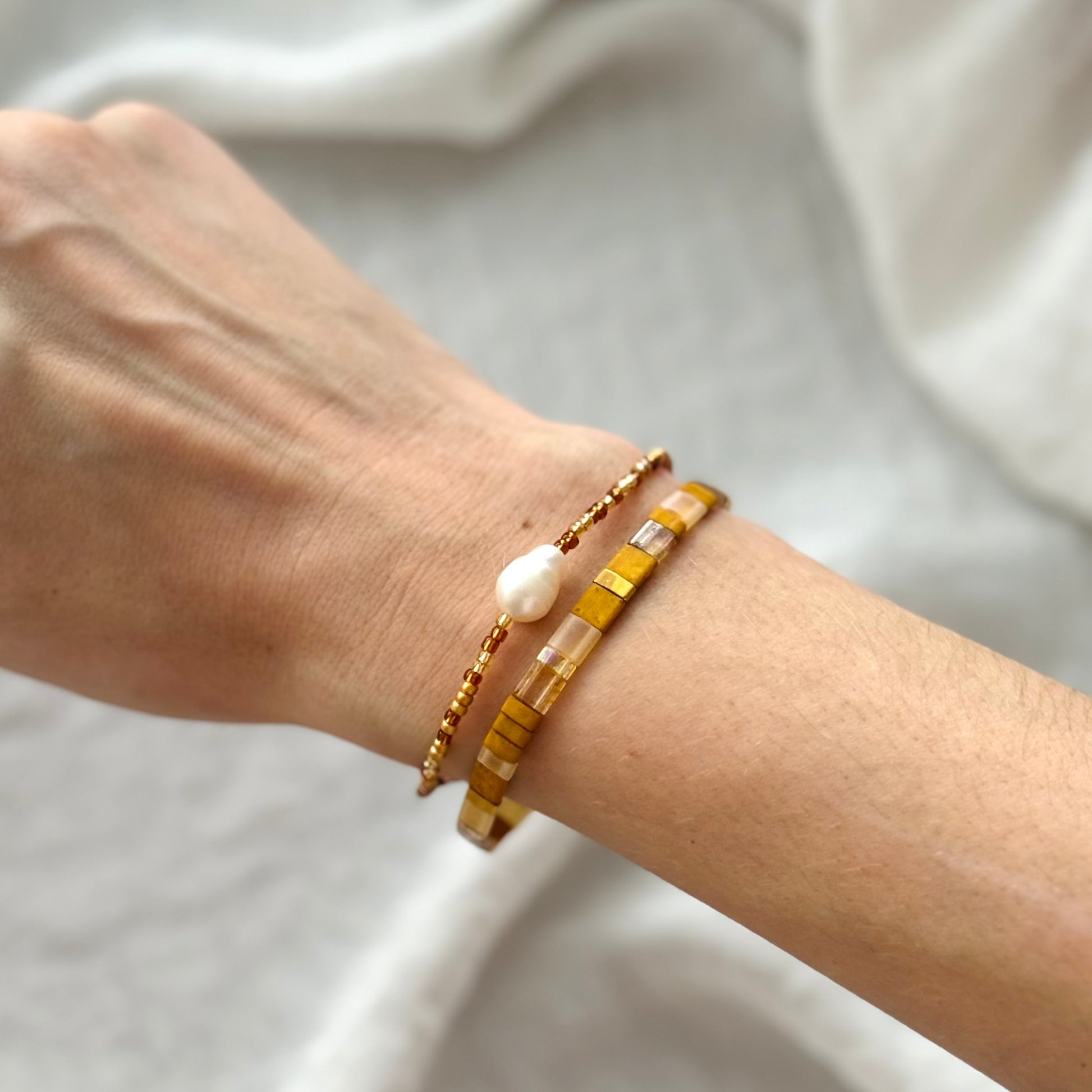 Dvojice náramků Medová v medově jantarových barvách spojuje precizní japonské skleněné korálky Myiuki s krásnou perlou.