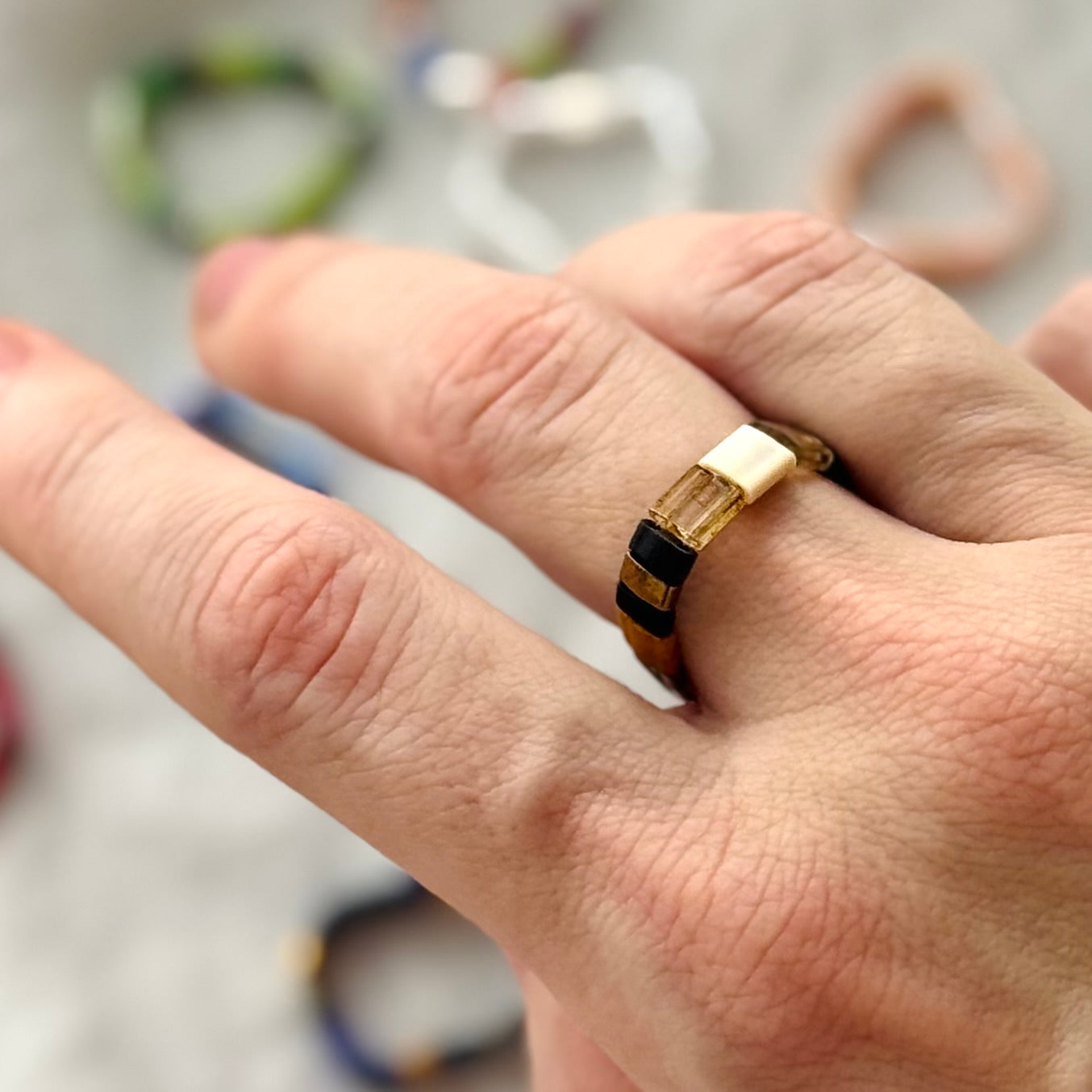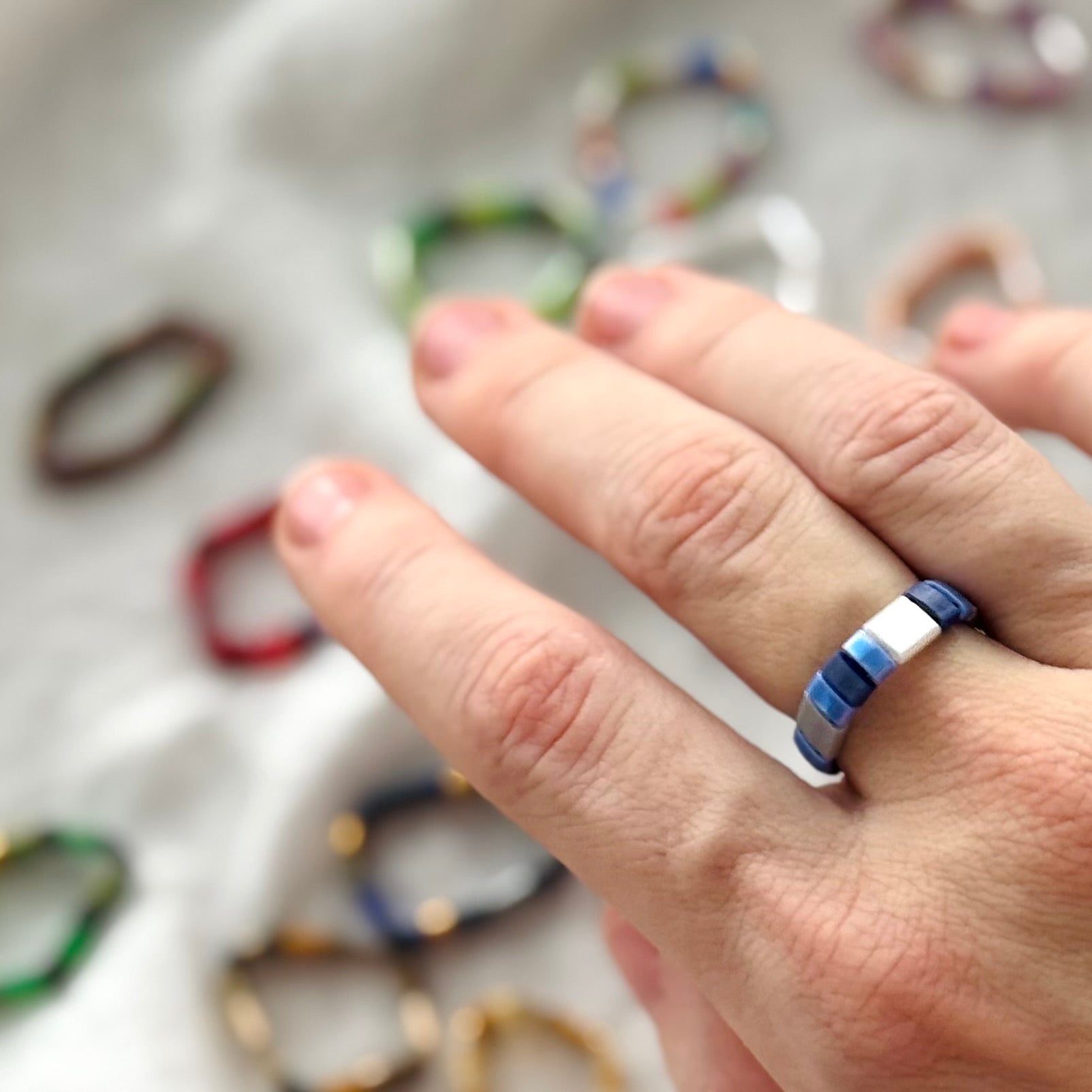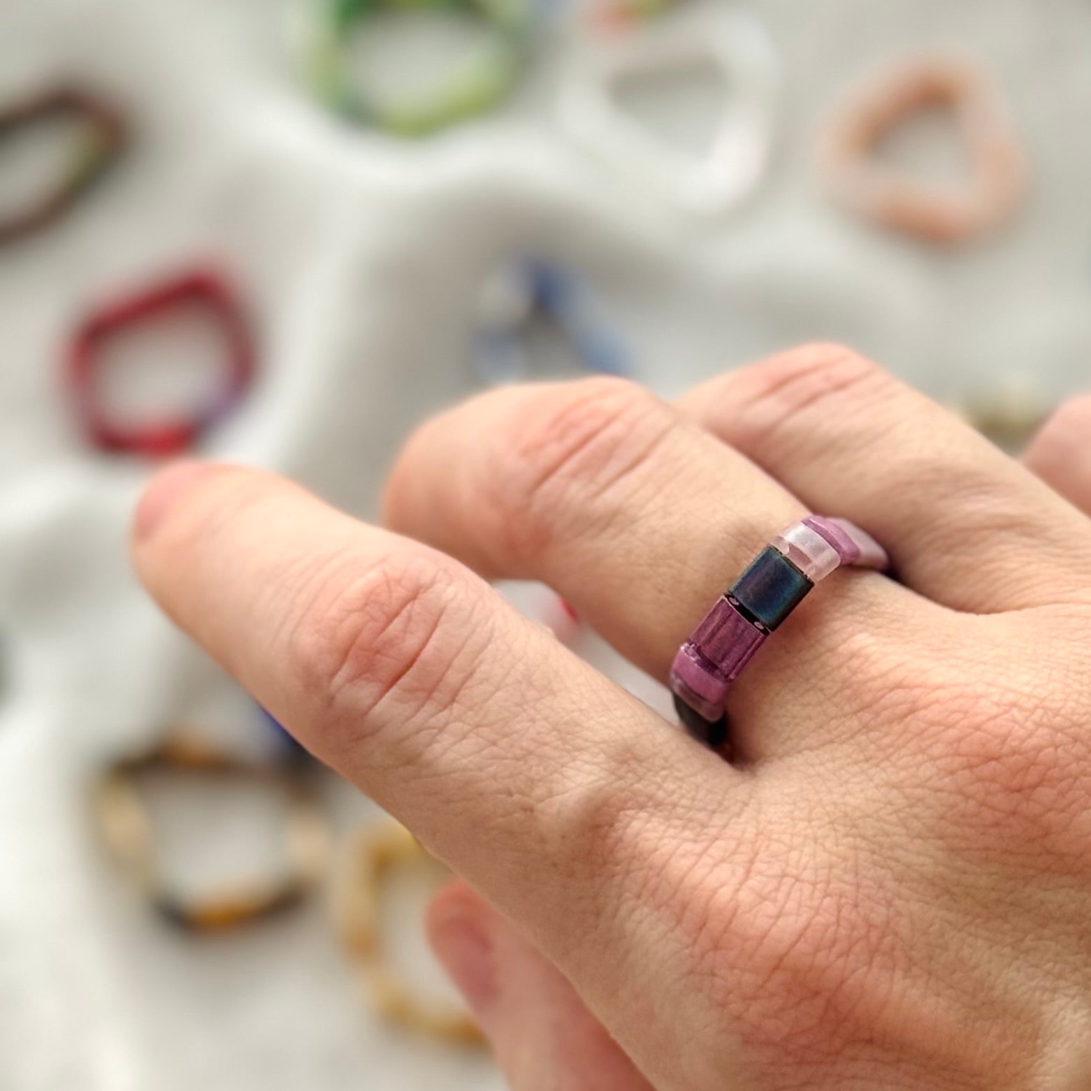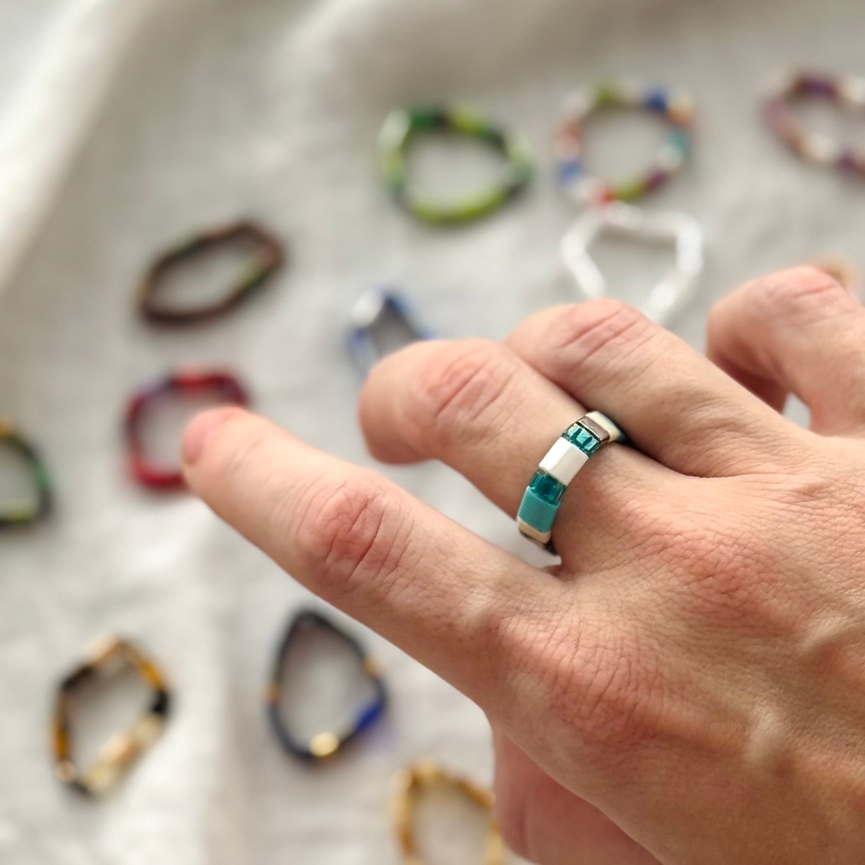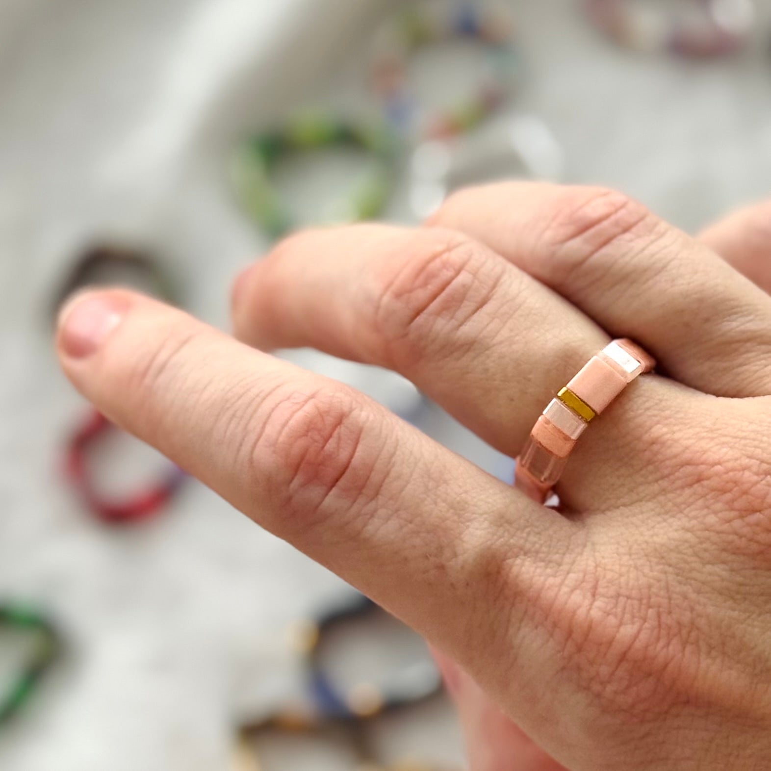 Prstýnky jsou tvořeny plochými japonskými korálky z vysoce kvalitního skla typu TILA, které přinášejí moderní a originální vzhled. Jsou navlečeny na pružné, ale odolné gumičce, takže se snadno navlékají a velikost se skvěle přizpůsobí.