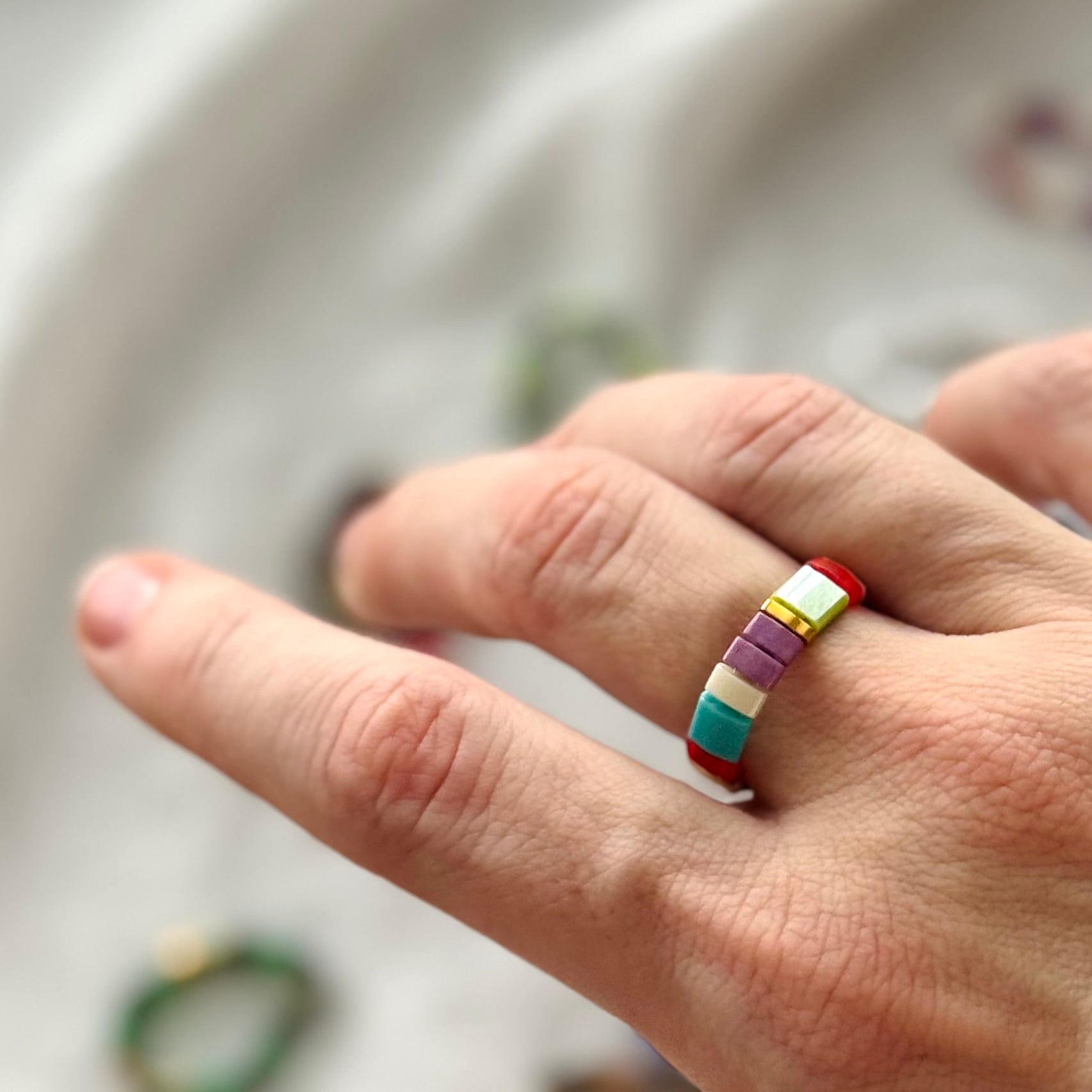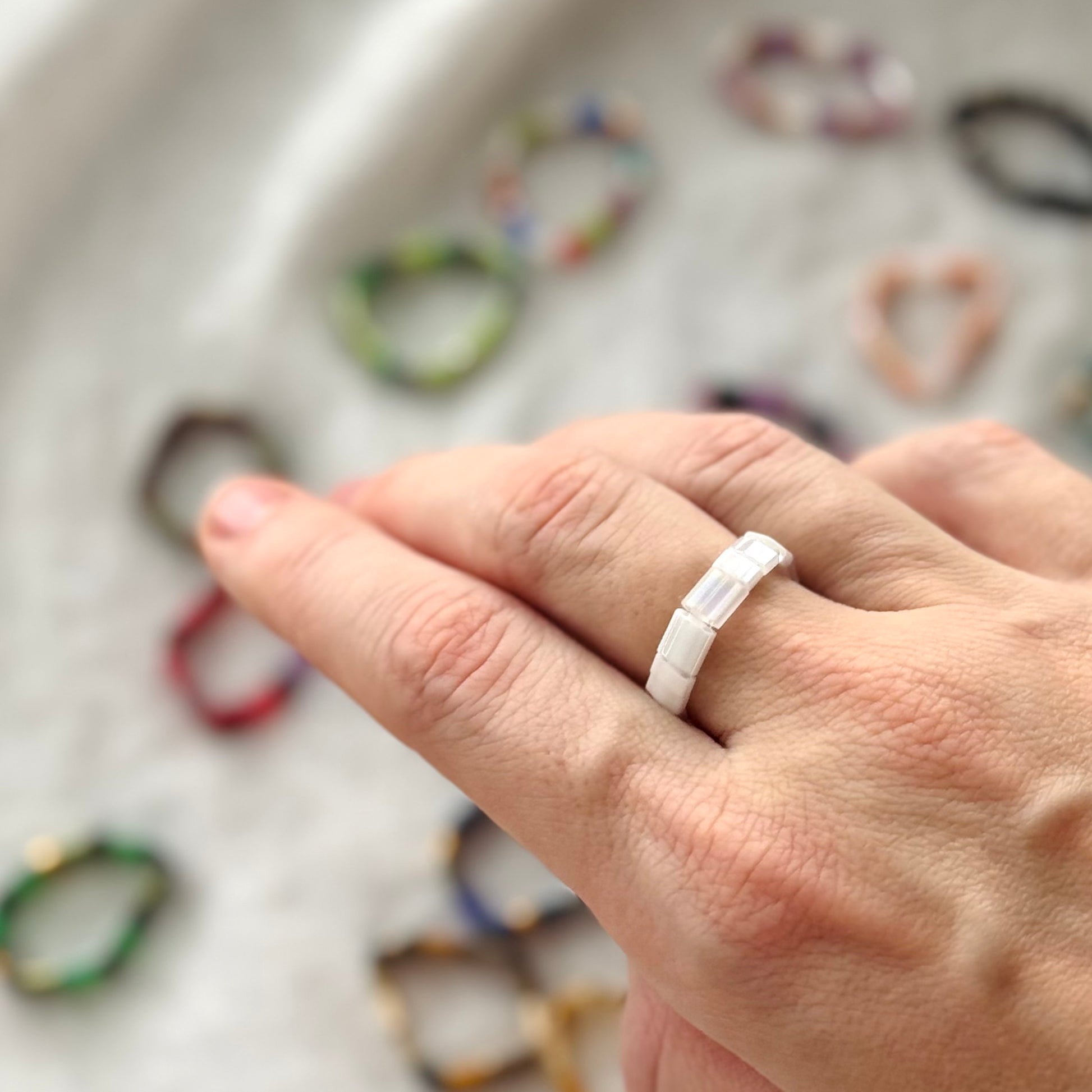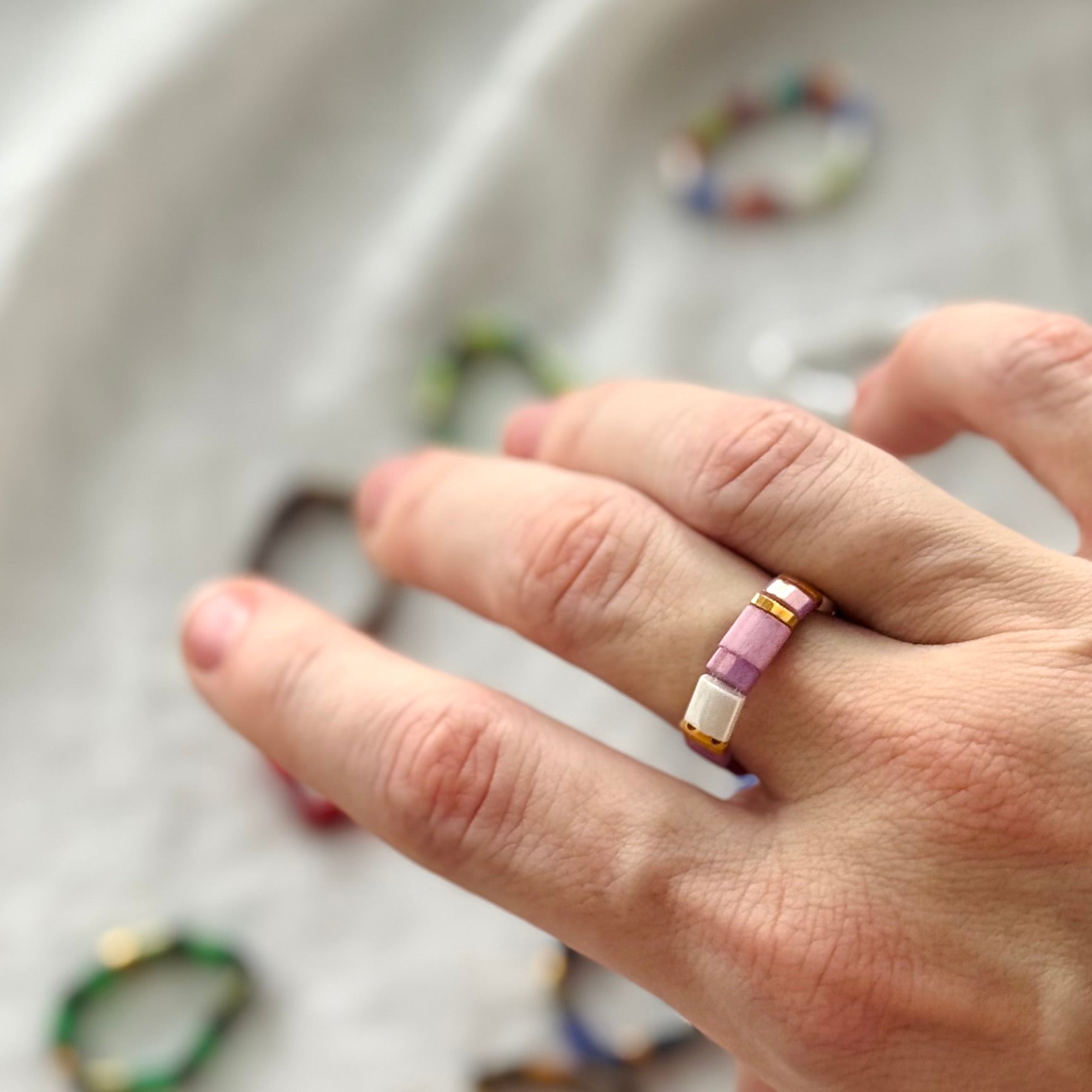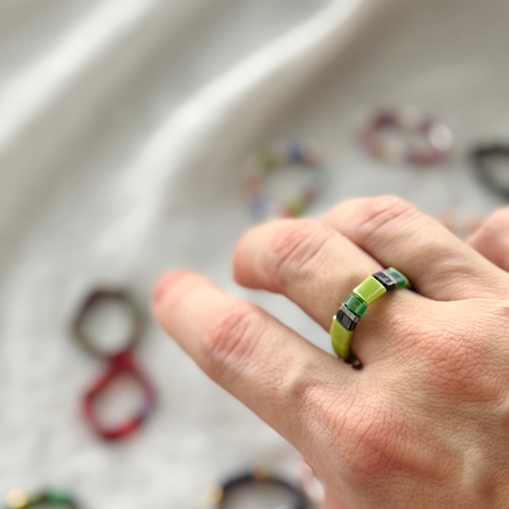 Prstýnky jsou tvořeny plochými japonskými korálky z vysoce kvalitního skla typu TILA, které přinášejí moderní a originální vzhled. Jsou navlečeny na pružné, ale odolné gumičce, takže se snadno navlékají a velikost se skvěle přizpůsobí.