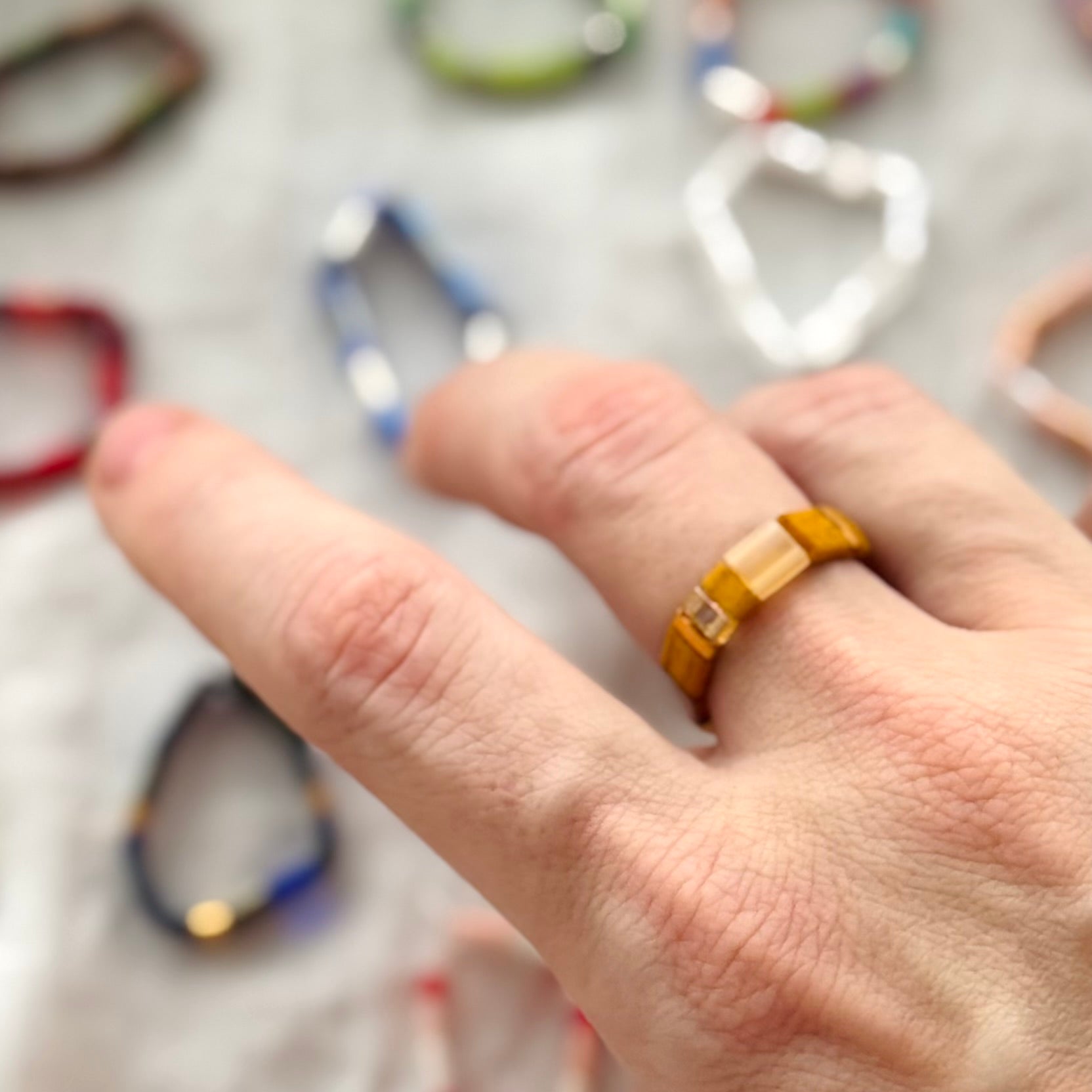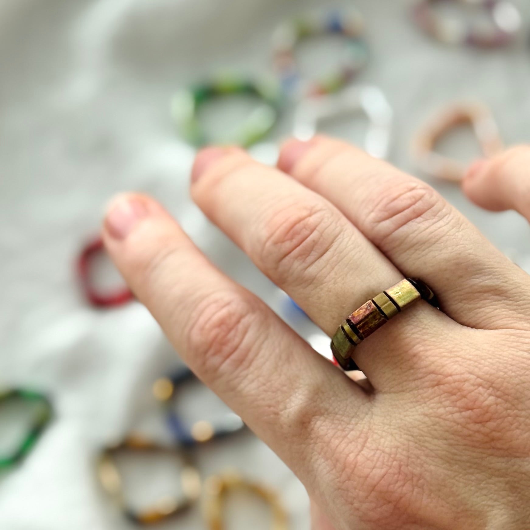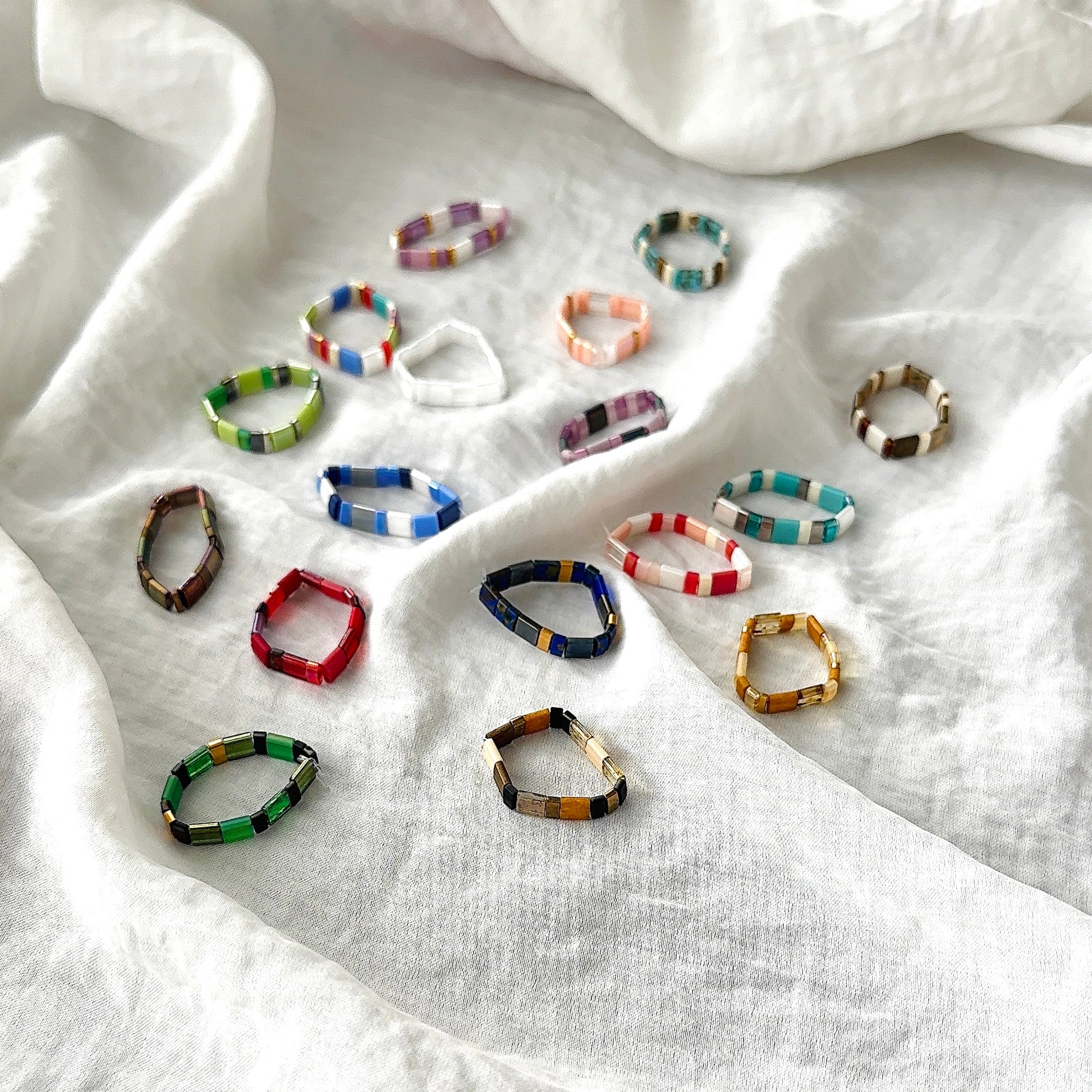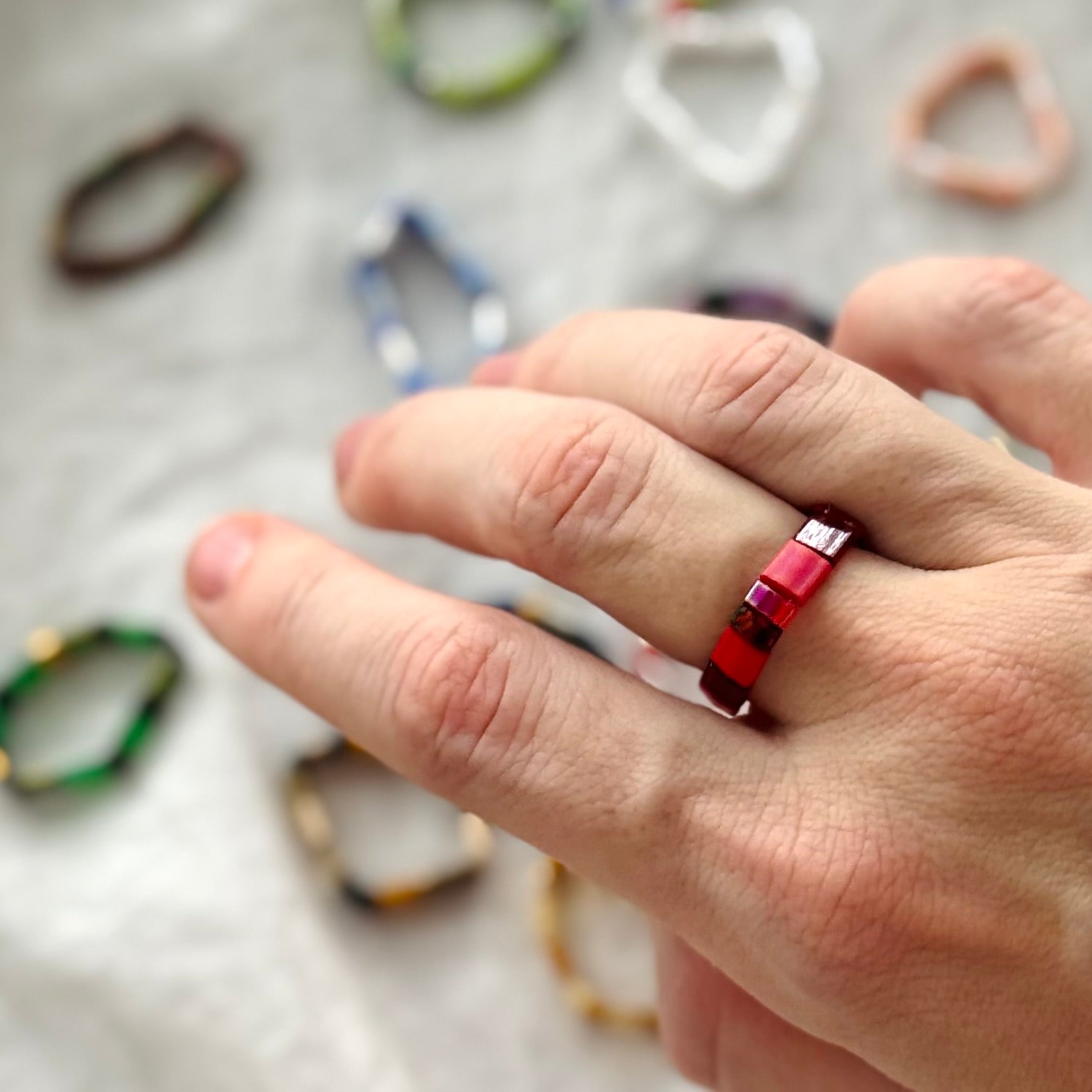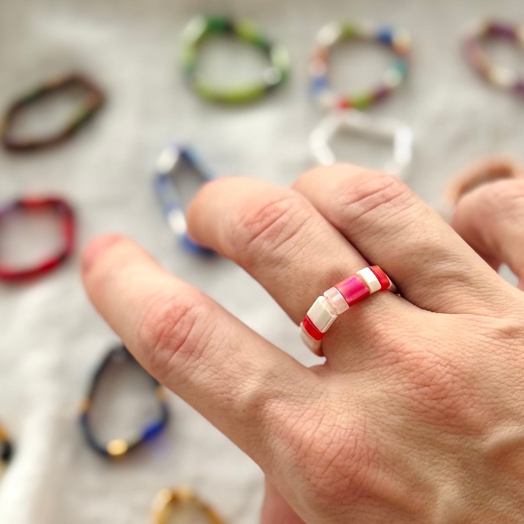 Prstýnky jsou tvořeny plochými japonskými korálky z vysoce kvalitního skla typu TILA, které přinášejí moderní a originální vzhled. Jsou navlečeny na pružné, ale odolné gumičce, takže se snadno navlékají a velikost se skvěle přizpůsobí.