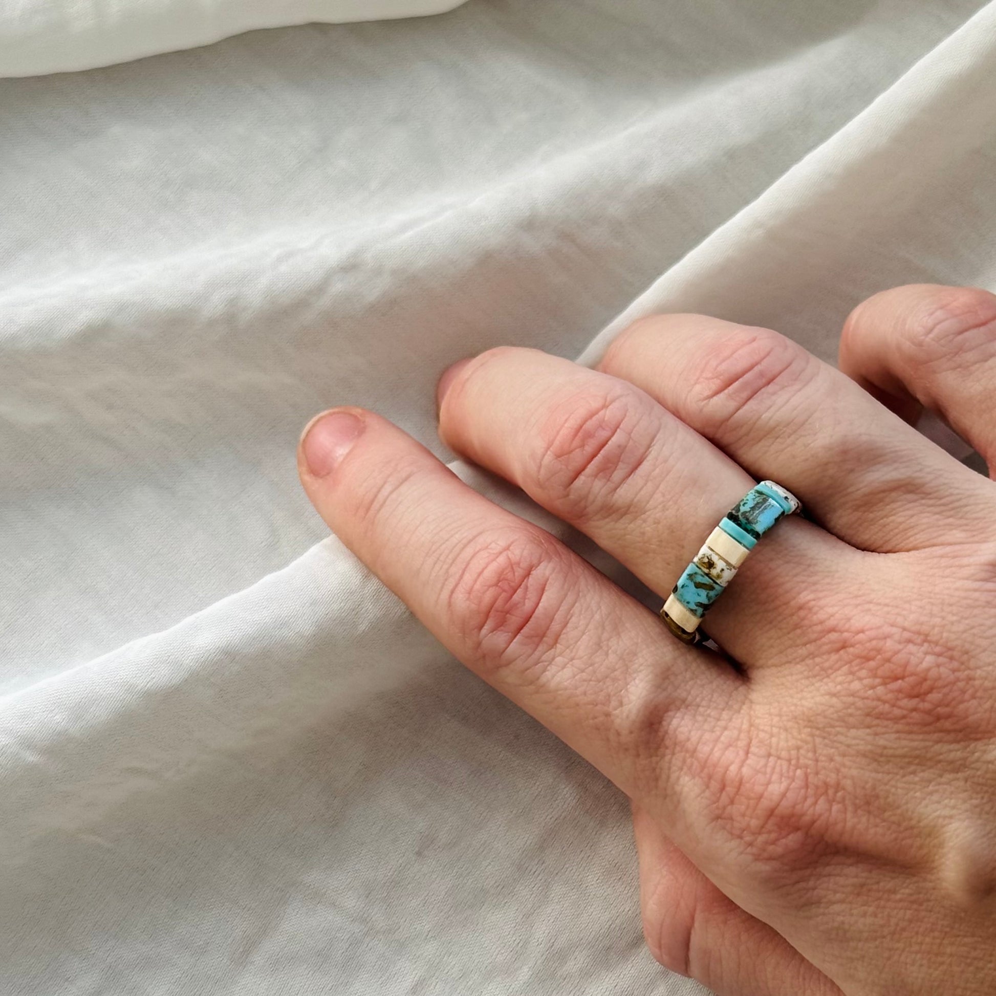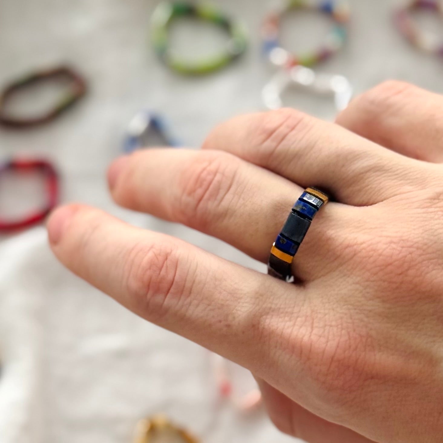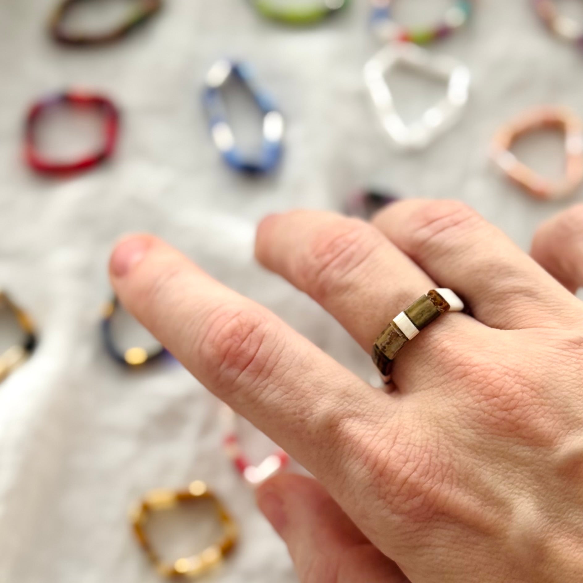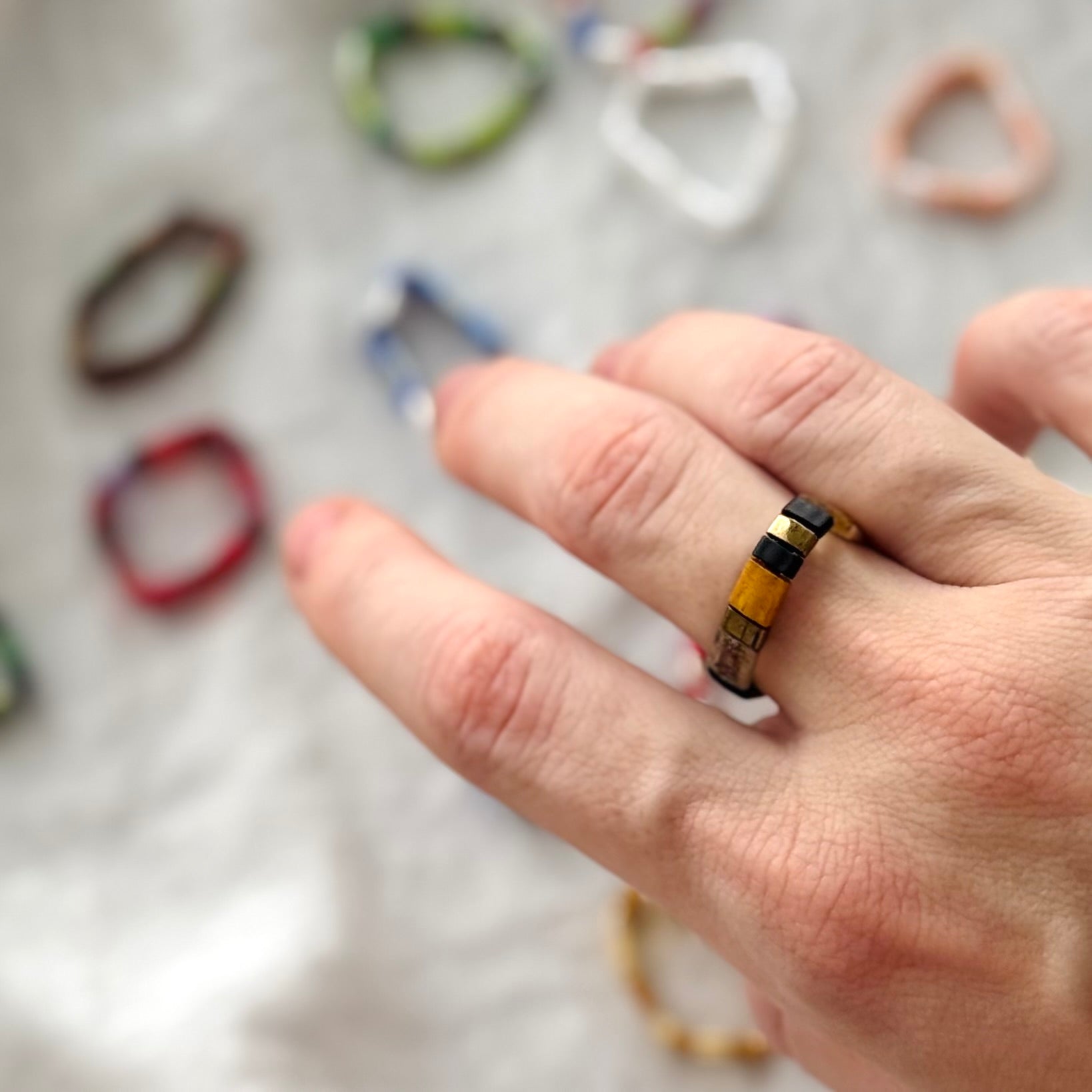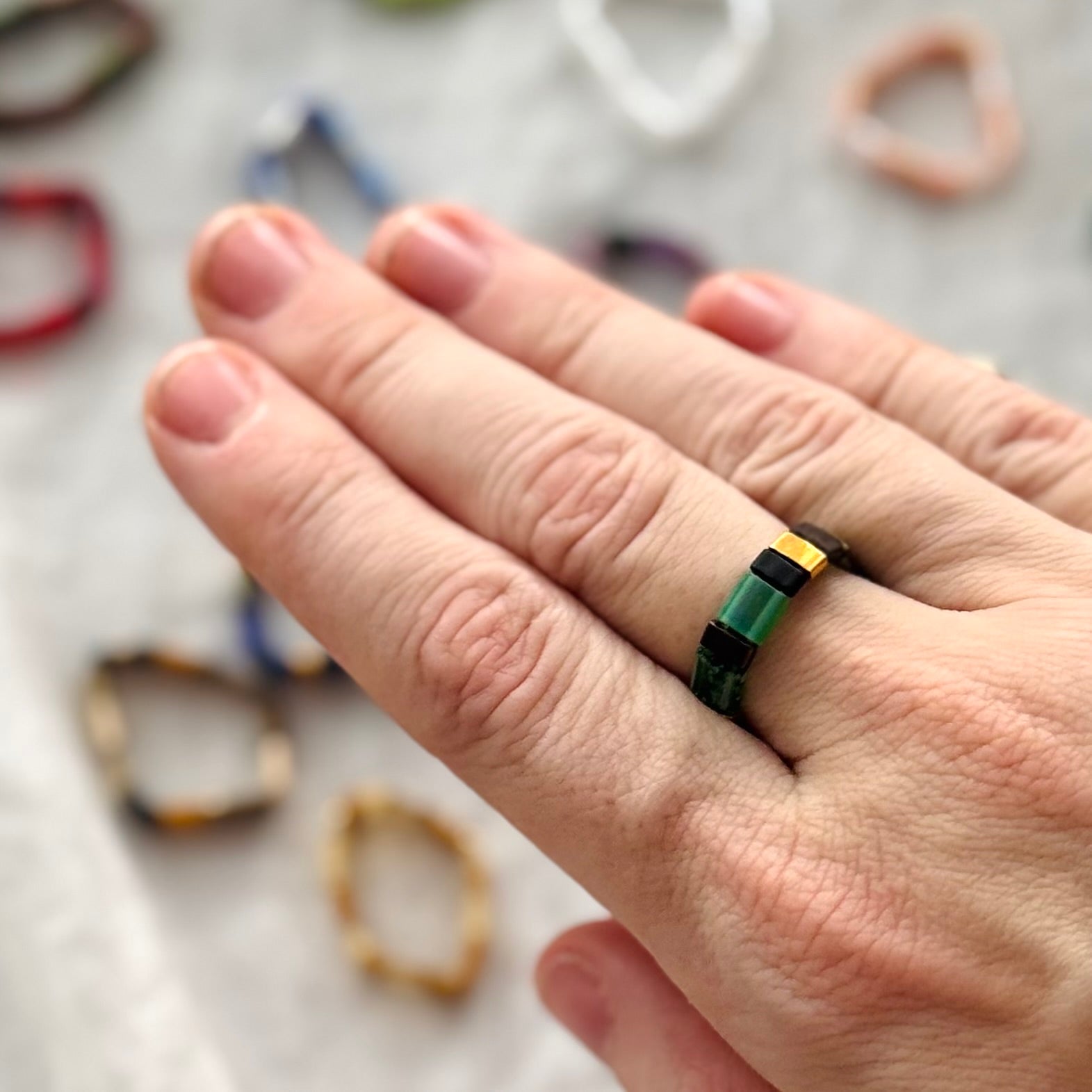 Prstýnky jsou tvořeny plochými japonskými korálky z vysoce kvalitního skla typu TILA, které přinášejí moderní a originální vzhled. Jsou navlečeny na pružné, ale odolné gumičce, takže se snadno navlékají a velikost se skvěle přizpůsobí.