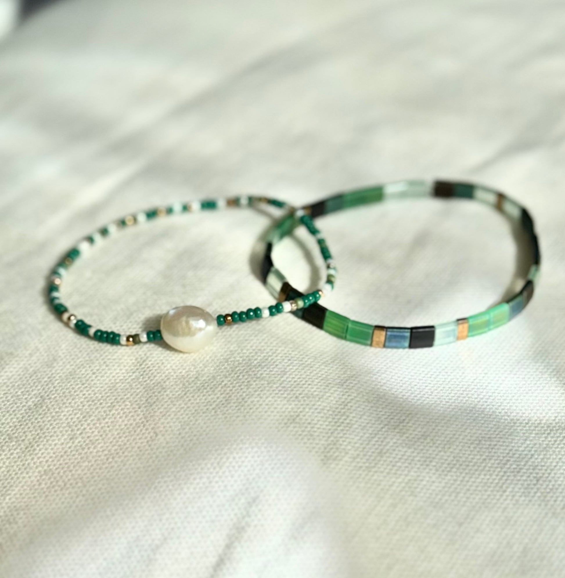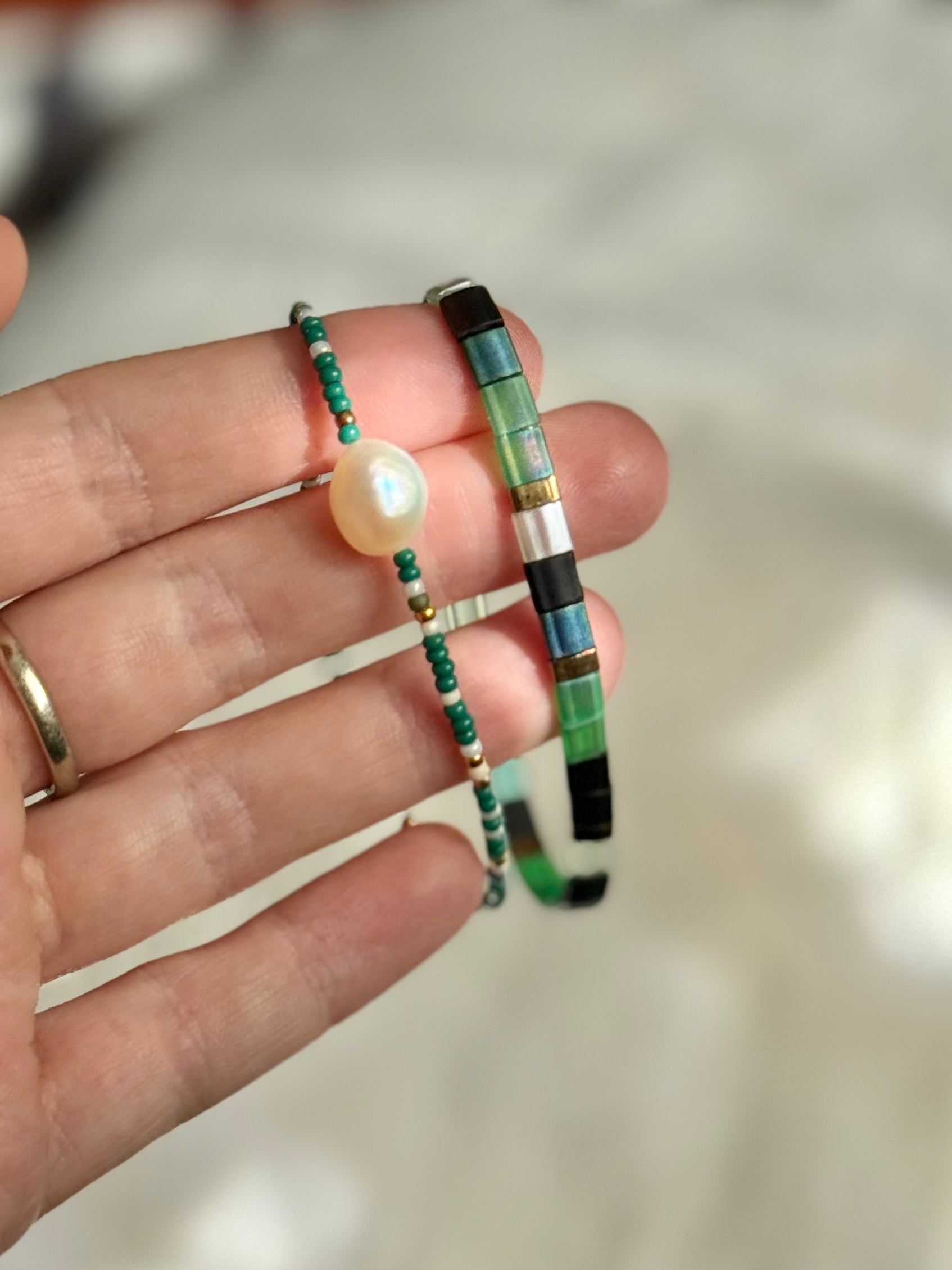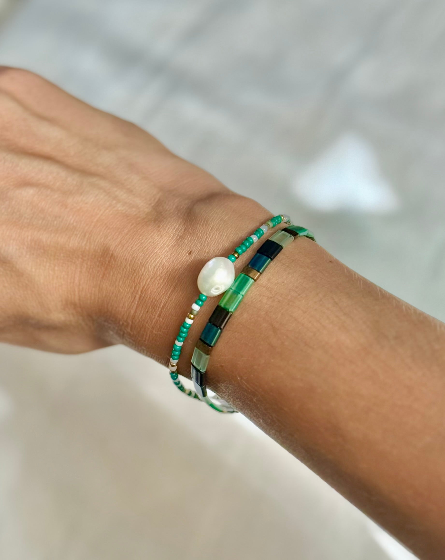 Tato dvojice náramků Esmeralda v zajímavých zelených barvách spojuje precizní japonské skleněné korálky Myiuki s krásnou perlou.